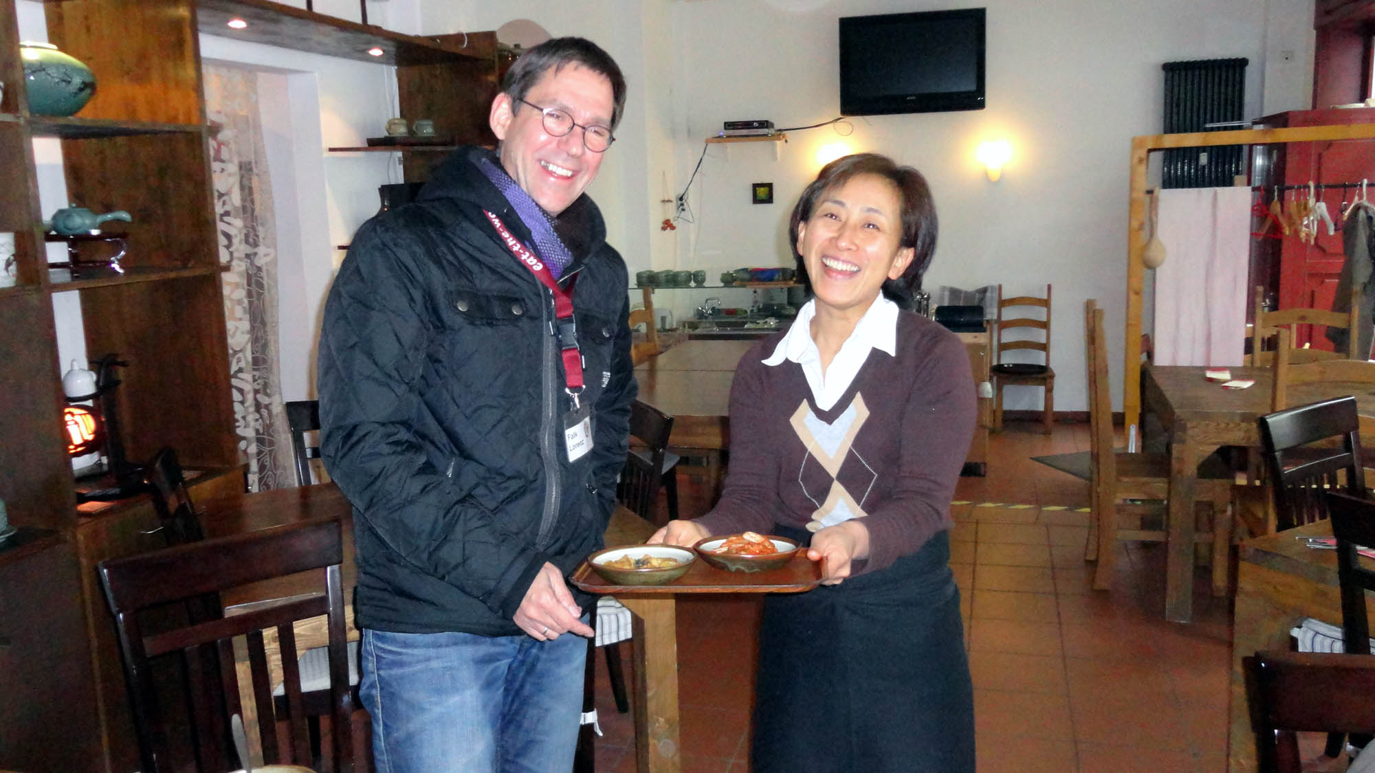 Nächste Station: Das koreanische Restaurant „Maru“ auf der Förstereistraße. Es gibt kleine Pastetchen und ein mir gänzlich unbekanntes Gericht, dass erst am Tisch fertig gerührt wird. Frau Kim lächelt und Falk Lorenz erläutert. Das 2008 eröffnete Restaurant wurde von der koreanischen Regierung unterstützt, um den kulturellen Austausch zu fördern. Während der Fußball-WM 2011 kehrte hier die koreanische Damenmannschaft ein. Spätestens jetzt hat er mich erwischt. Denn hier war ich noch nie drin. Das könnte doch mal ein Imbiss-Test werden. Weiter ziehen wir, noch fünf Stationen stehen auf der Liste. Doch die soll ich bitte nicht verraten, schließlich soll die Tour überraschend sein. „Ziel von eat-the-world.com ist es, kleine Betriebe mit guter Qualität aus Gastronomie und Kulinarik zu unterstützen“, erklärt mir Falk Lorenz. Filialen von großen Ketten und industriell gefertigte Speisen haben keine Chance, auf einer Tour vorgestellt zu werden.
