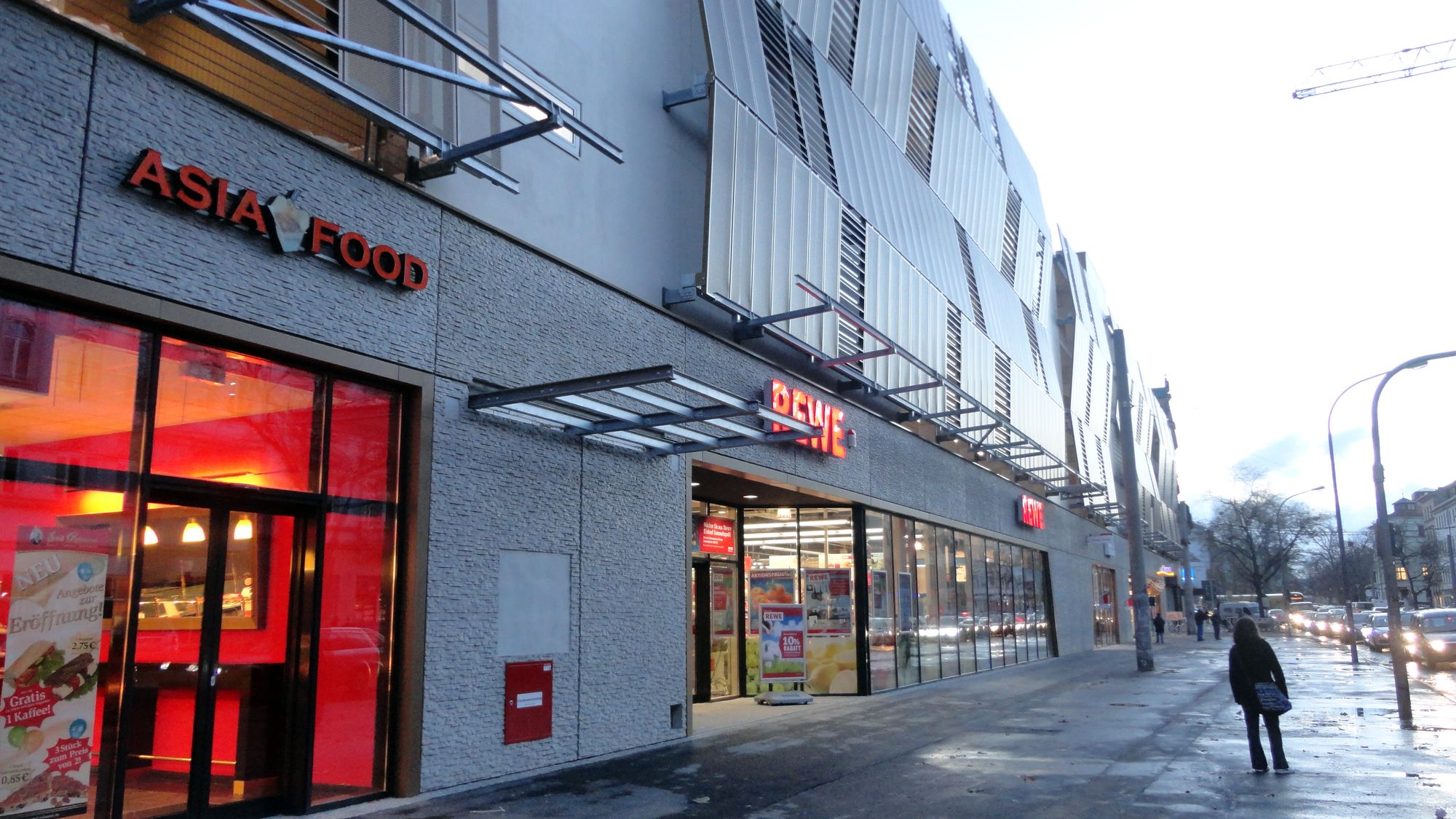 also: vorn ist der bäcker, schräg dahinter der asia-imbiss mit durchgang direkt in den rewe. beide haben nichts miteinander zu tun.
