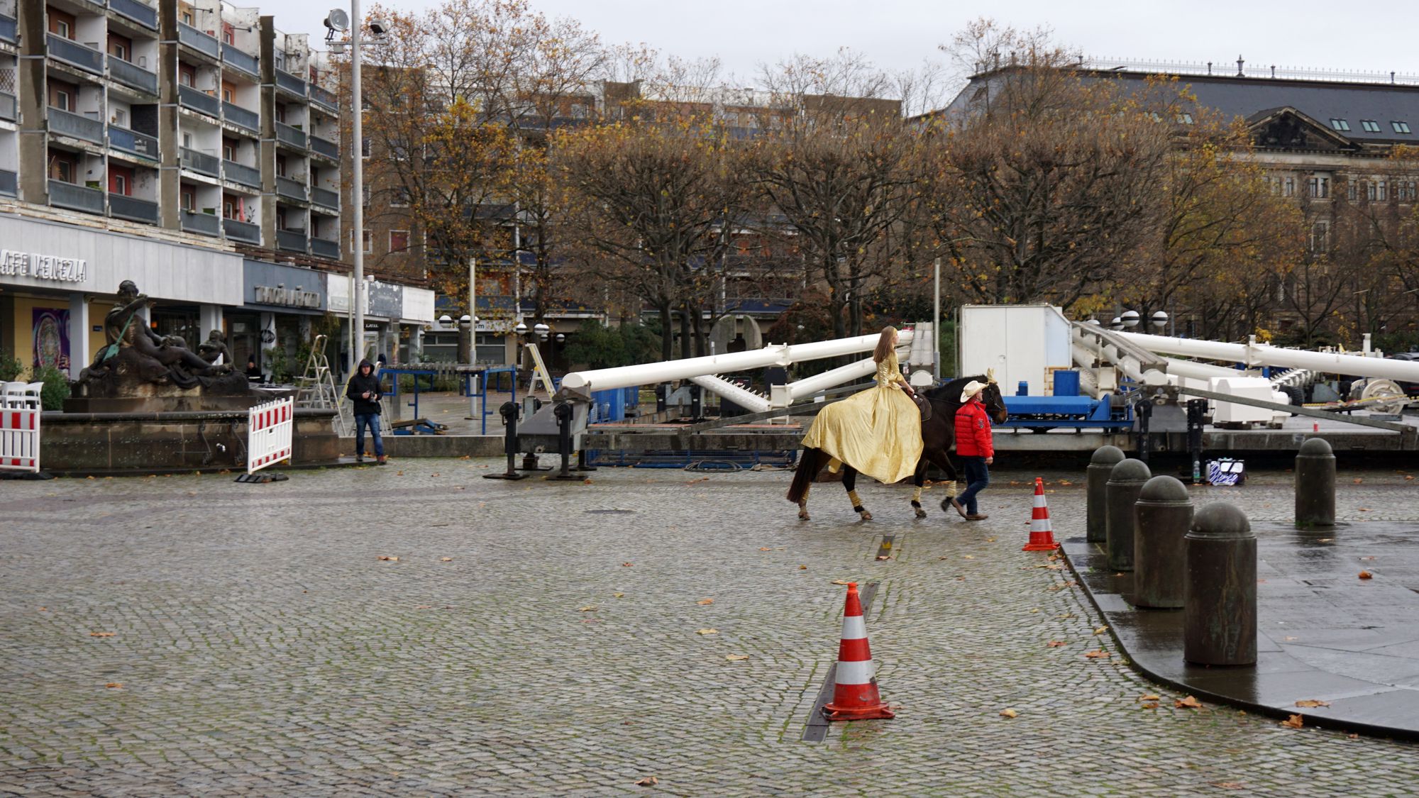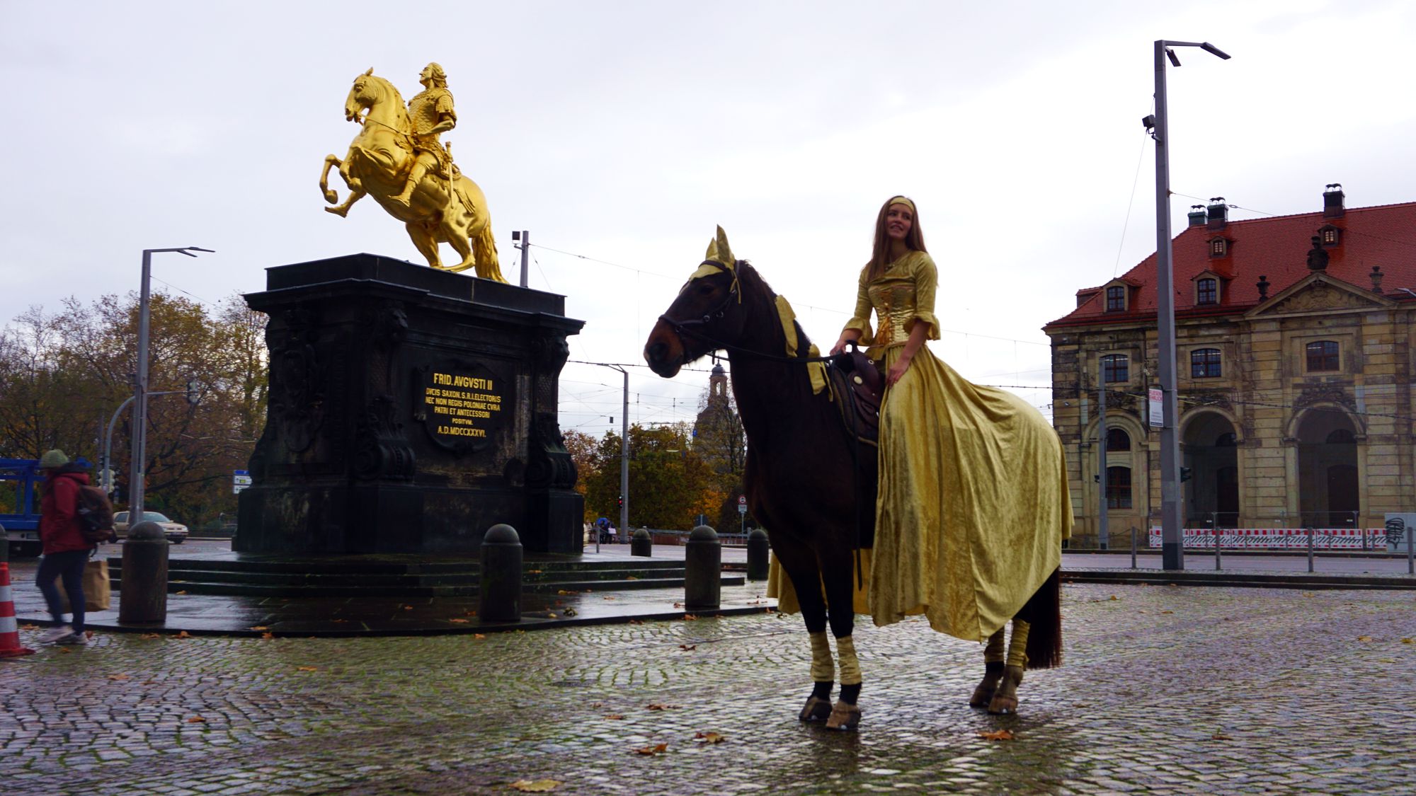 Als das Pferd, sein Name ist Apollo, wie wir erfahren, ausreichend verziert ist, laufen wir ihm zögernd nach. Aus Regenverstecken kriechen weitere Fotografen herbei und schießen die ersten Fotos. Das ganze Gold gibt einen schönen Kontrast zum Novemberhimmel ab, Apollo ist trotzdem noch immer wenig davon angetan, zwischen Denkmal und der Baustelle, die bald zum Augustusmarkt wird, hin und her zu latschen.