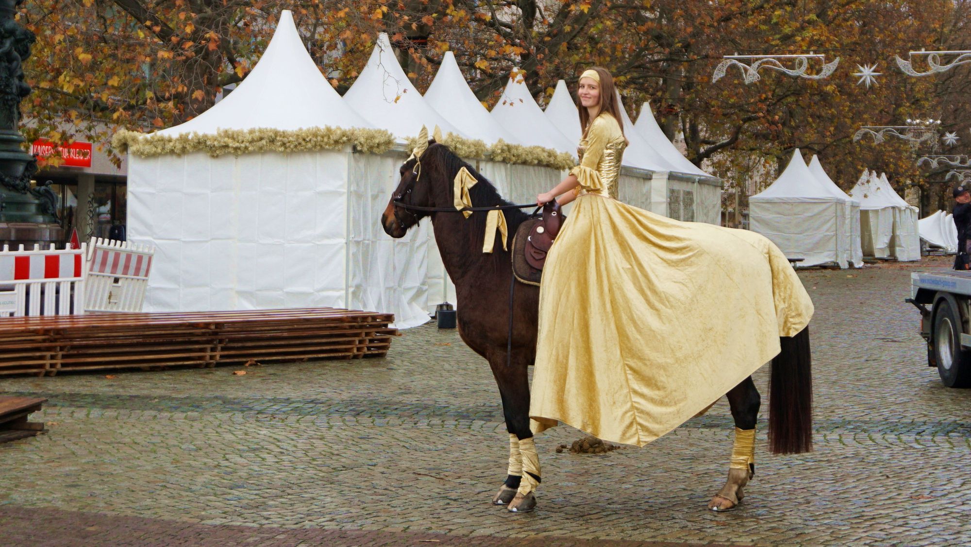 Ungleich souveräner und mit bescheidenem Stolz thront Julia auf ihm. Die 18-Jährige wurde auserwählt, das ehrenvolle Amt der Goldenen Reiterin zu bekleiden. Was das denn beinhalte, frage ich. Naja, sie sei eben die Schutzpatronin des Marktes. Vor der Kälte möchte sie zum Beispiel schüzen. Na, darauf hat sie ja wohl kaum Einfluss. Faktisch ist ihre Aufgabe doch vielmehr die, an ein paar einzelnen Tagen ihren in ein Paillettengewand gehüllten Körper von glühweintrunkenen Typen begaffen und kommentieren zu lassen.