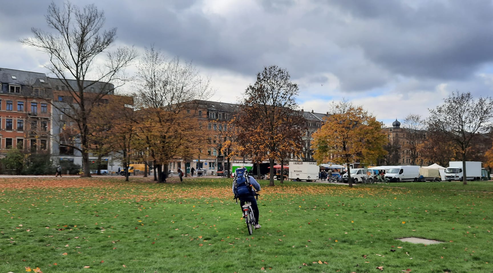 Es ist kalt und grau an diesem Novembermorgen im Alaunpark – die meisten zieht es ins Haus, einen schreckt das Wetter allerdings selten ab – Olaf Straube, besser bekannt als „der Tänzer“, sitzt im Schneidersitz in der Wiese. Er tanzt so ziemlich jeden Tag – und das seit etwa sieben Jahren. „Vor zehn Jahren hätte ich nicht geglaubt, dass das geht“, erzählt der Familienvater lachend. Freundlicher Blick, hellblauer Pulli, Fahrrad, Reiserucksack, und natürlich: weiße Turnschuhe, die Treter zum Tanzen.