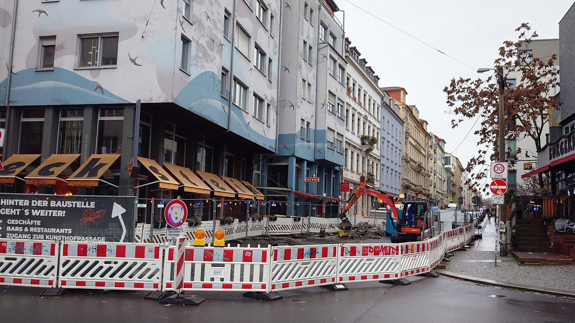 Die Gewerbetreibenden hatten kurz nach Einrichtung der Baustelle zusammengelegt und mit einem Banner am Baustellenzaun drauf hingewiesen, dass es im oberen Bereich noch Geschäfte, Bars & Restaurants gibt.