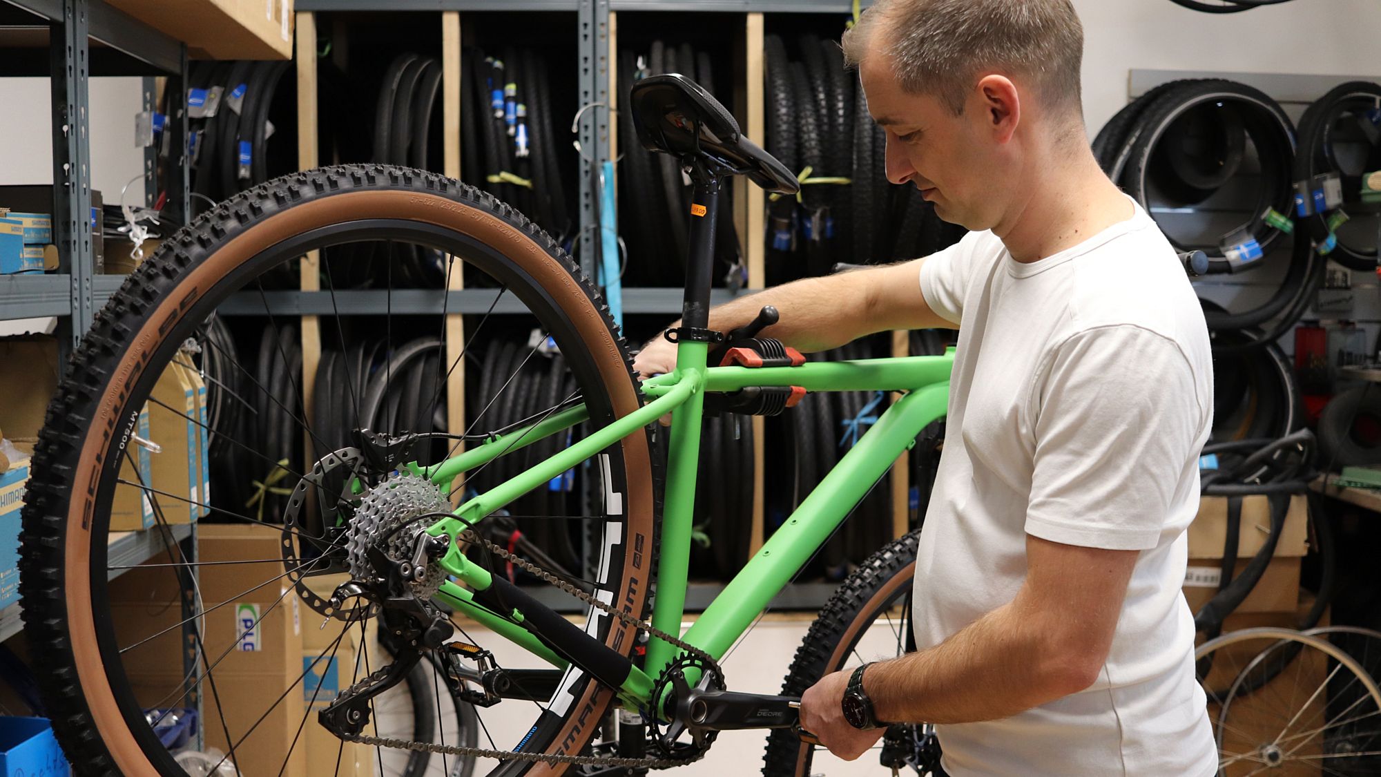 Jetzt im Winter ist es etwas ruhiger im Geschäft. Dennoch ist immer was zu tun. Gerade hat Robert Frank die letzten Wicklungen am Rennlenker eines neuen Gravelbikes fertig verklebt, dann nimmt er sich Zeit für eines seiner Lieblingsmodelle. Ein grünes Mountain-Bike. „Alles nur mit besten Shimano-Teilen“, sagt er und zeigt, wie die Kette über die Ritzel schnippt. Vater Andreas holt währenddessen den Glühwein raus. Dann stoßen die beiden auf den doppelten Geburtstag an.