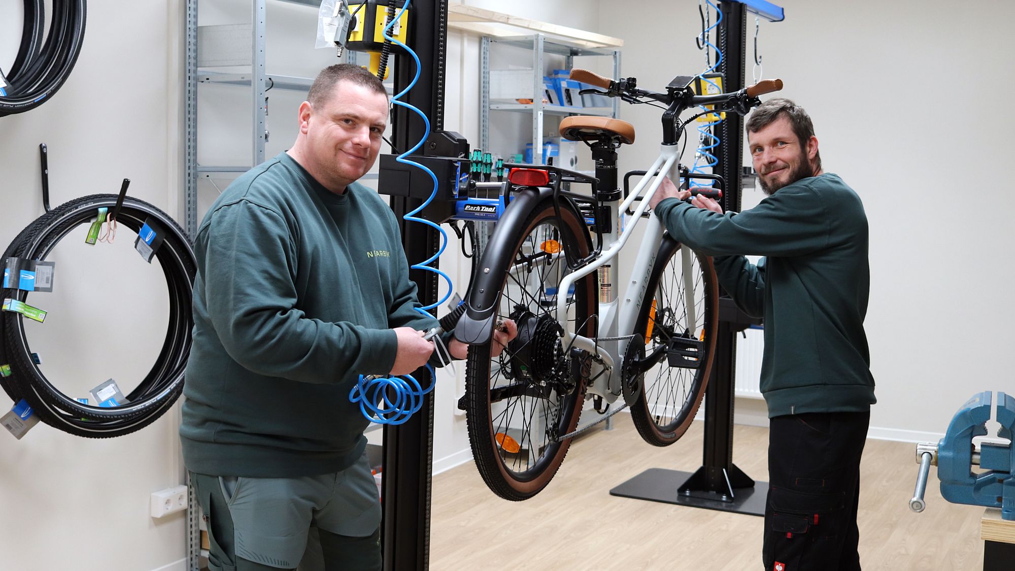 Neben dem einen Fahrrad gibt es noch ein bisschen Zubehör, wie Helme oder Schlösser und eine recht große Werkstatt. Dort nehmen die Mechaniker Sandro, Mike und Paul nicht nur die eigene Marke an, sondern reparieren alles, was ihnen vorbei gebracht wird. Sandro, der bisher in einem Fahrradladen im Umland gearbeitet hat, sagt, dass der Service schon ganz gut angenommen wird. Fahrräder haben sie noch nicht so viele verkauft, das liege aber auch an der Jahreszeit. Das sei aber auch ganz gut, weil sie sich so hier gut einarbeiten könnten und dann dem vermutlich größeren Andrang im Frühjahr gut gewachsen sind.