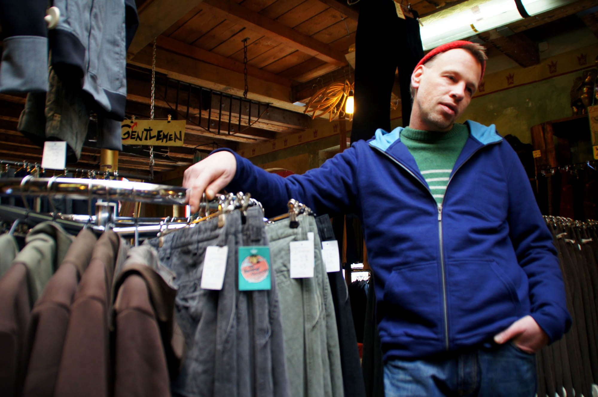 Zu einem unanhängigen Stil gehört eine unabhängige Produktion. Die Klamotten für den Hippie-Verkauf werden in einer fruchtbaren Zusammenarbeit mit Werkstätten in Gubin und Lodz produziert. Perfekte Standorte: nah gelegen, auf EU-Level, mit garantiertem Mindestlohn und fairen Arbeitsbedingungen für die Mitarbeiter. Für die neuen Kollektionen finden konspirative Treffen mit den Schneider/innen statt, man bespricht Muster und Schnitte. Was dann dabei herauskommt, quetscht sich wie bunte Blütenstauden, wollig bis schlüpfrig, bauschig bis kratzig in die Anti-Mainstream-Höhle in der Kunsthofpassage. Handgemalte Schilder weisen den Weg durch den Textil-Urwald, der aber doch mittlerweile etwas geordneter wirkt. Eine jede noch so wilde Dame wird eben irgendwann reifer.