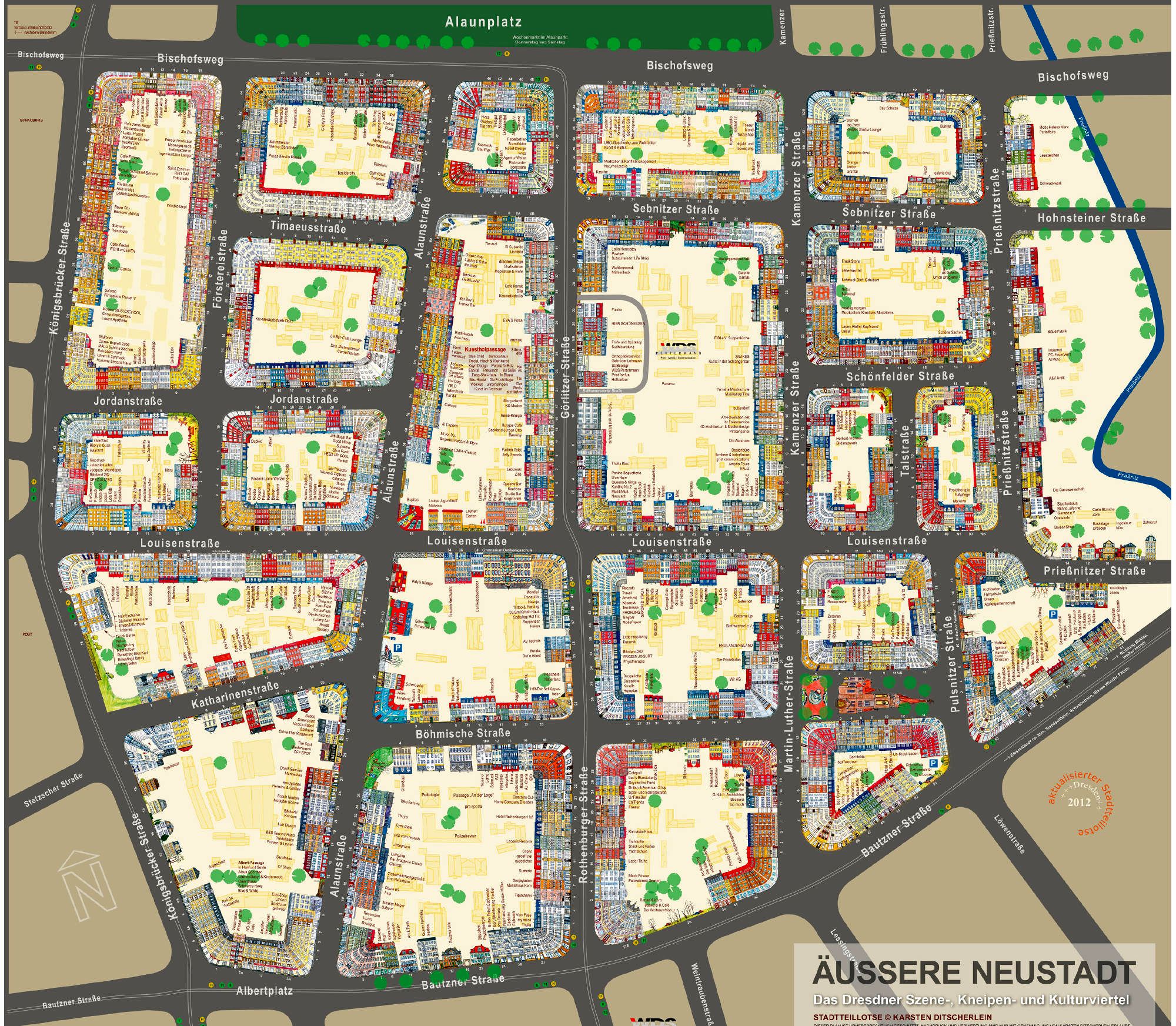 Den Stadtteillotsen im Format von 68 mal 87 Zentimetern gibt es unter anderem im Perlaiffaire, Prießnitzstraße 60; im Reisebuchladen, Louisenstraße 38; beim Stü in Büchers Best, Louisenstraße 37; in Richters Buchhandlung, Förstereistraße 44, im Kunst im Freiraum in der Kunsthofpassage; im Piepapo, Louisenstraße 5 und eigentlich auch im Schwipsbogen-Shop, dort aber im Moment noch nicht gelistet.