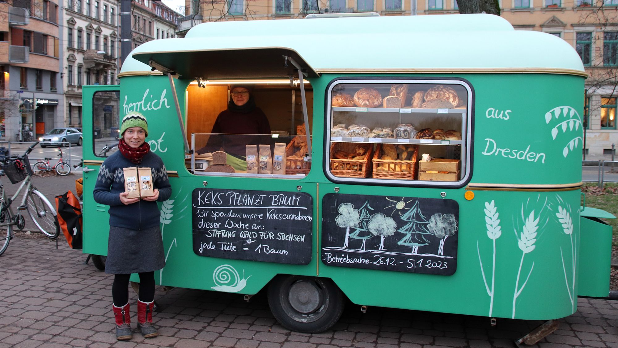 Seit zwei Jahren verkauft sie jetzt unter dem Label „herrlich brot“ ihre Backwaren, die sie früher im Hecht-Viertel, jetzt in einer kleinen Backstube in Pieschen anfertigt, auf dem Alaunplatz. „Anfangs war ich immer noch mit dem Lastenrad hier, aber seit diesem Jahr verkaufen wir aus unserem kleinen grünen Wohnwagen“, erzählt sie.