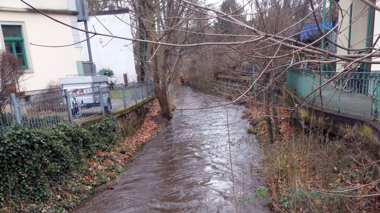 Im Neustädter Bereich staut sich durch das Hochwasser auch die Prießnitz zurück. An der Mündung unterhalb des Diakonissenkrankenhauses stehen schon Warnbaken bereit. Vorsicht beim Betreten der Brücke und des Ufers.