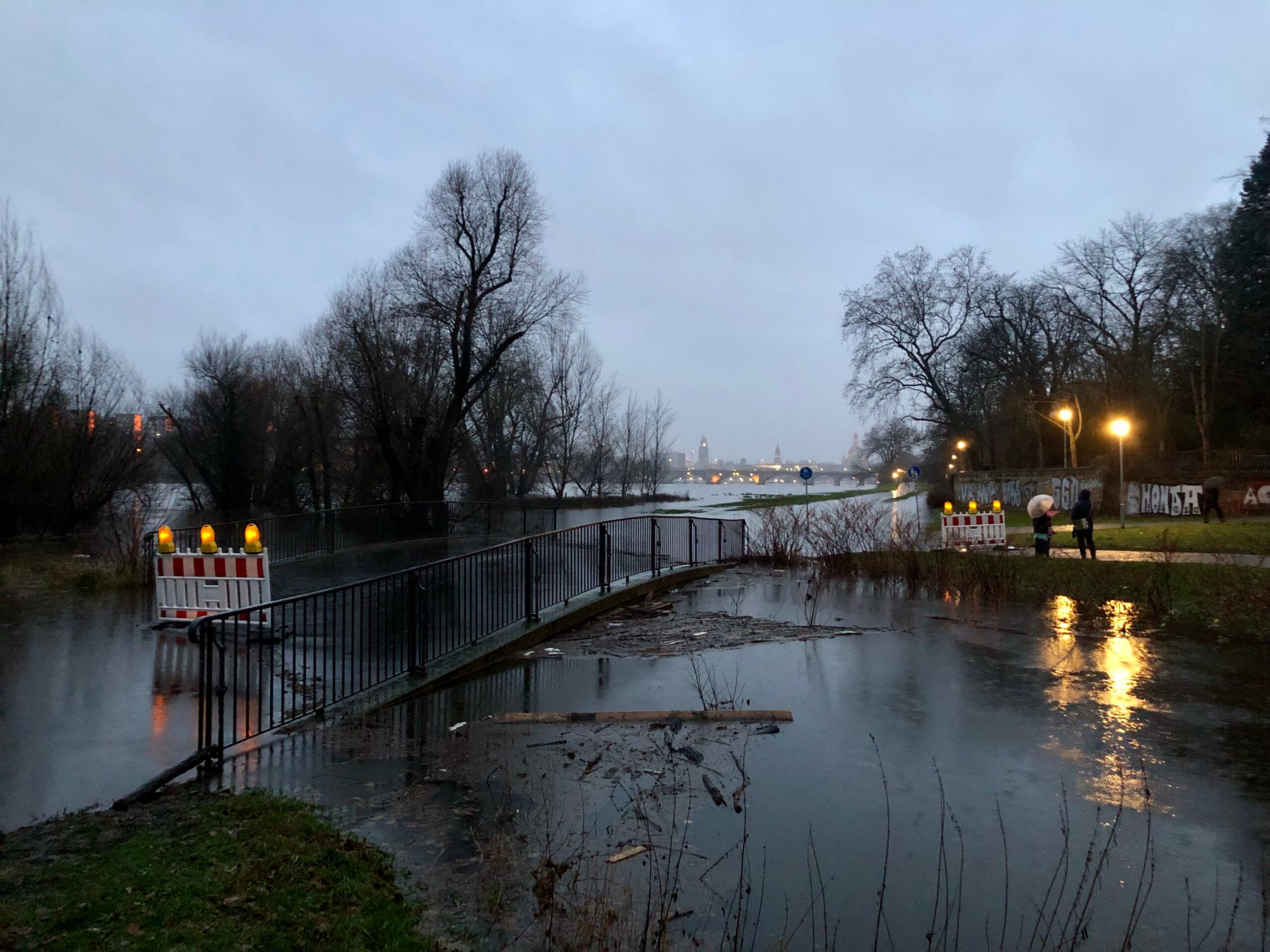Am Pegel Dresden wird mit einem Überschreiten des Wasserstandes der Alarmstufe 2 (500 Zentimeter) am Montag, 25. Dezember 2023 vormittags gerechnet. Aktuell, 24. Dezember, 16.30 Uhr, wird in Dresden ein Pegel von 4,73 Meter gemessen.