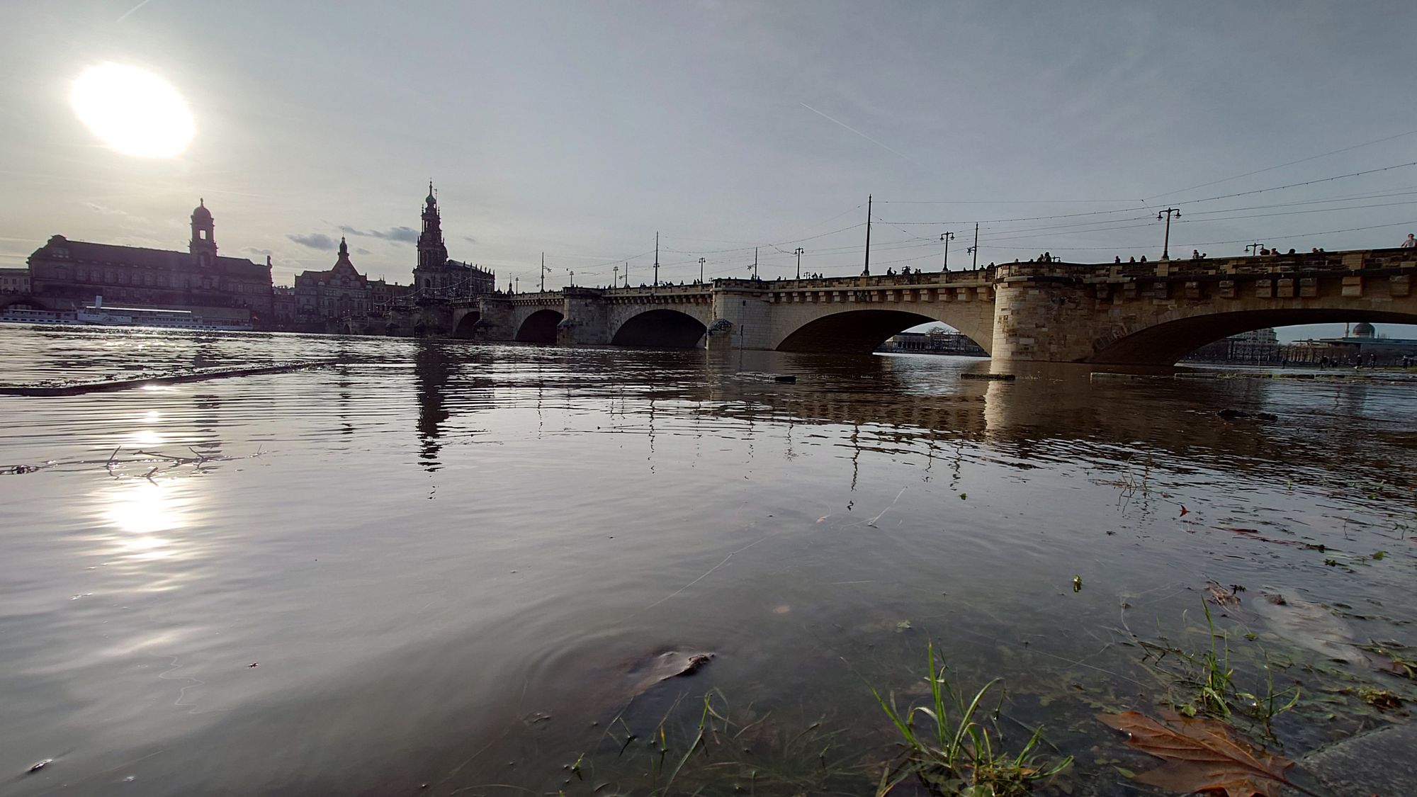 Gestern hieß es beim Landeshochwasserzentrum noch, dass die Elbe in Dresden den 6-Meter-Pegel heute Vormittag erreicht wird. Aber die Elbe lässt sich Zeit. Bis 18 Uhr ist sie erst auf 5,88 Meter geklettert. Immerhin hoch genug, um auf der Neustädter Seite große Teile des Elberadwegs und der Elbwiesen unter Wasser zu setzen.