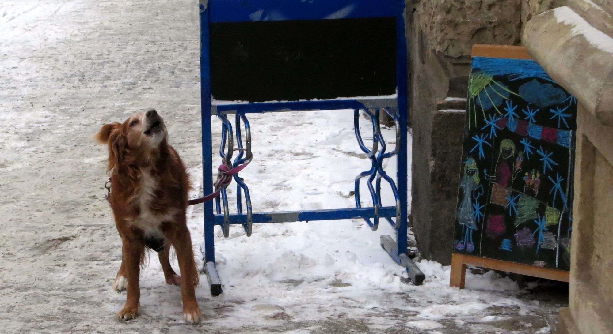 Beim gemütlichen Schlendern durch die verschneite Neustadt freue ich mich, dass alle Geräusche ein wenig leiser und gedämpfter sind. Selbst die sonst so rumpelige Bautzner Straße gibt sich friedlich und ruhig. Schön! Doch dann zieht mir ein Jaulen das Herz zusammen. Vorm Bio-Laden auf der Martin-Luther-Straße beklagt sich in höchsten Tönen eine kleine Töle: „Es ist zu kalt, um am Fahrradständer angebunden zu sein!“