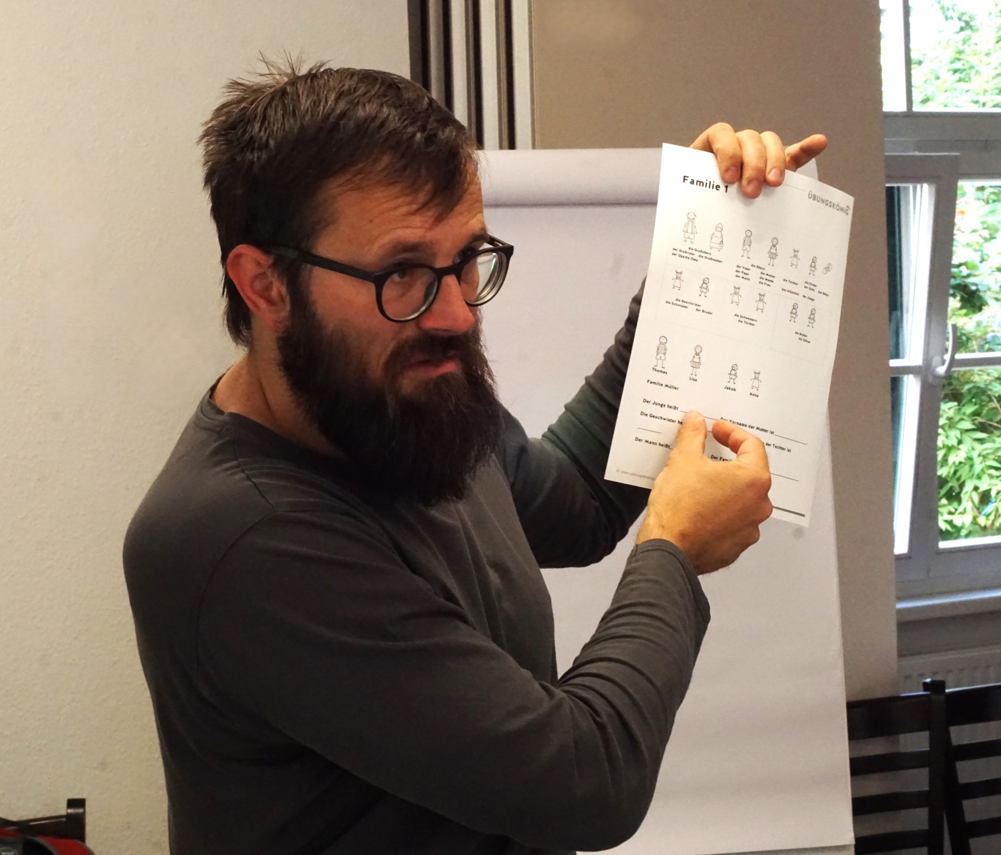Sergey, ein etwas älterer Mann, hat sein eigenes russisch-deutsches Bildwörterbuch mitgebracht. Auch Lehrer Norbert Richter arbeitet mit Bildern, auf einem Arbeitsblatt gibt es Piktogramme für „Oma“, „Opa“, „Tochter“. Zu Beginn soll jeder das Bild in seiner Heimatsprache gebärden.