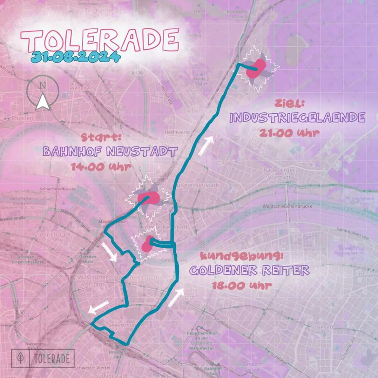 Die Tolerade startet um 14 Uhr mit einer Kundgebung am Bahnhof Neustadt. Gegen 15 Uhr soll es Richtung Marienbrücke gehen, den Landtag, Theaterplatz und den Postplatz passieren, bevor es über die Marienstraße, die Budapester Straße und die Ammonstraße zum Dresdner Hauptbahnhof geht. Dort wird es keine Kundgebung geben, sondern der Weg soll über die St. Petersburger Straße, die Carolabrücke und den Carolaplatz bis zum Neustädter Markt gehen. Dort wird von 18 bis 19.15 Uhr eine Zwischenkundgebung stattfinden, bevor sich die Demostration über die Albertstraße, den Albertplatz und die Königsbrücker Straße ins Dresdner Industriegelände bewegen wird, wo die Versammlung gegen 21 Uhr beendet werden soll.