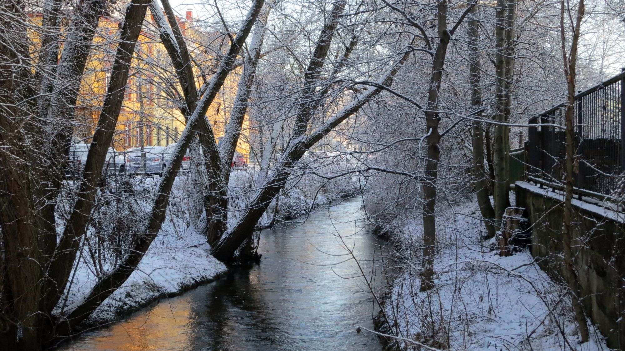 Wenn es über Nacht schneit und der Morgen mit strahlendem Sonnenschein lockt, lacht das Fotografenherz. Dementsprechend konnte man heute Morgen auch etliche Kamera-Träger auf dem Alaunplatz bewundern. Für alle, die den Morgen versäumt haben, hier eine kleine Auswahl. Der Rundgang startet an der Prießnitz, an der kleinen Brücke des Bischfsweges. die Prießnitz