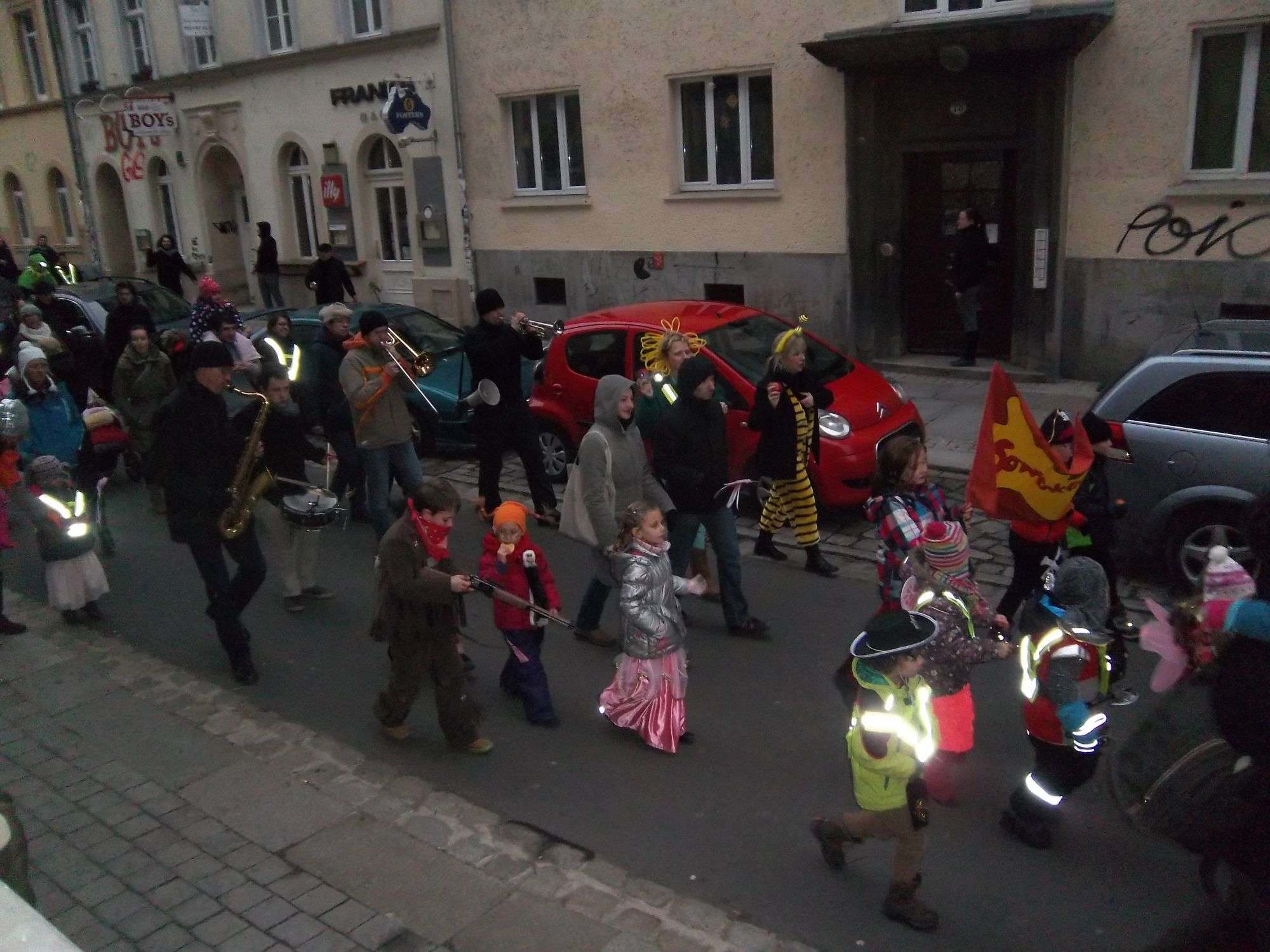 Ein lustig-bunter Fastnachtsumzug pilgerte diesen Nachmittag unter Blaskapellen-Begleitung über die Alaunstraße. Den hochgehaltenen Transparenten war zu entnehmen, dass es sich bei den großen und kleinen Jecken um „Sonnenkleckse“ von der gleichnamigen Kita auf der Kamenzer Straße handelte. In Gegenwart der ausgefallenen Kostüme und der schmissigen Klänge fügte sich das Blaulicht der begleitenden Polizeiwagen wie Partybeleuchtung ein. Danke für die Sonnenkleckse am dunkelnden Nachmittag!