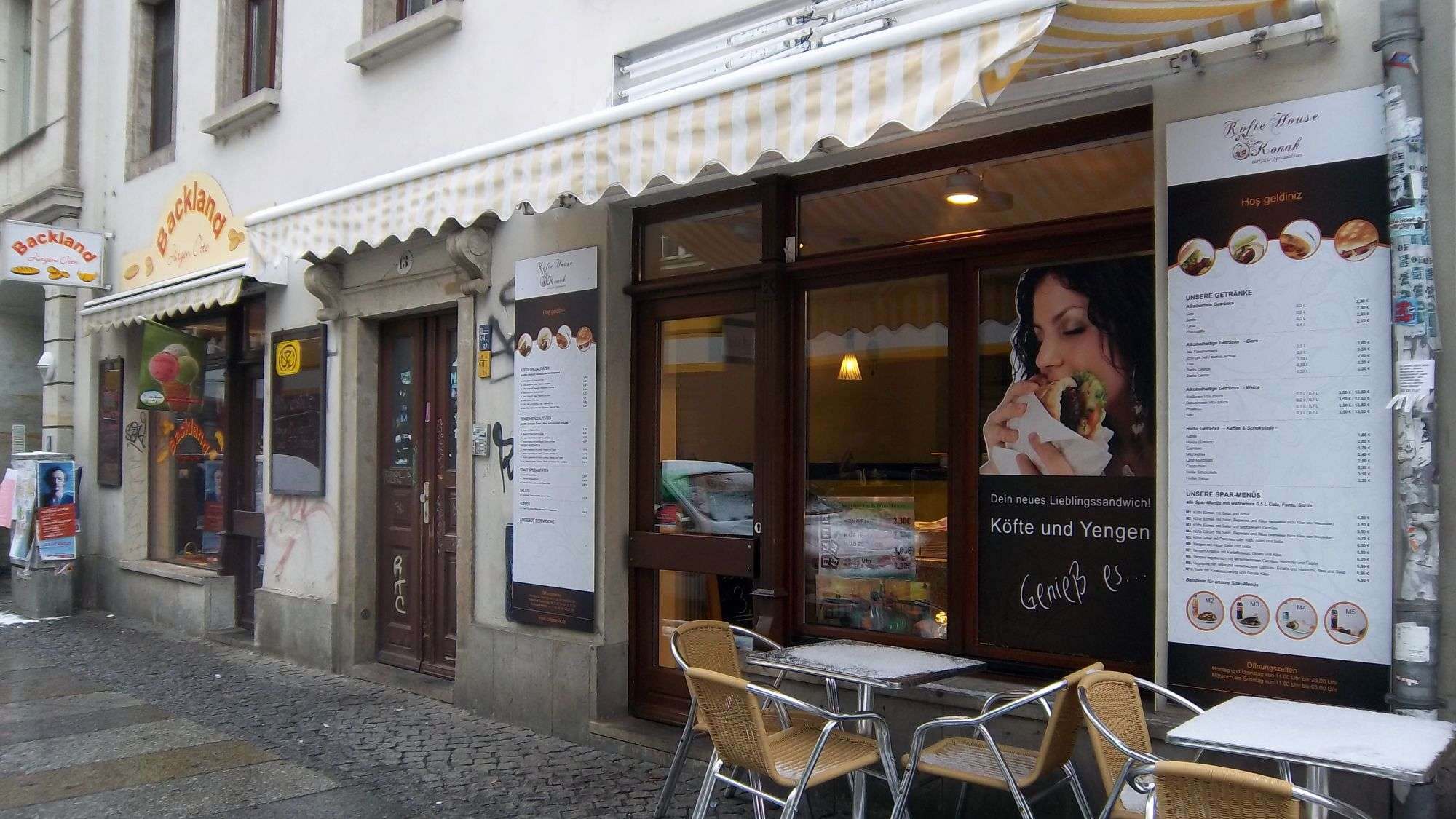 Aus dem kleinen Café neben dem Backland an der Görlitzer Straße 13 ist jetzt ein Sandwich-Laden geworden. Köfte, so die Wikipedia sind meist kräftig gewürzte, gebratene, gebackene oder gegrillte Hackfleischbällchen. Hier gibt es sie nun als Sandwich. Das Konak gibt es ein paar Häuser weiter auch als Café.