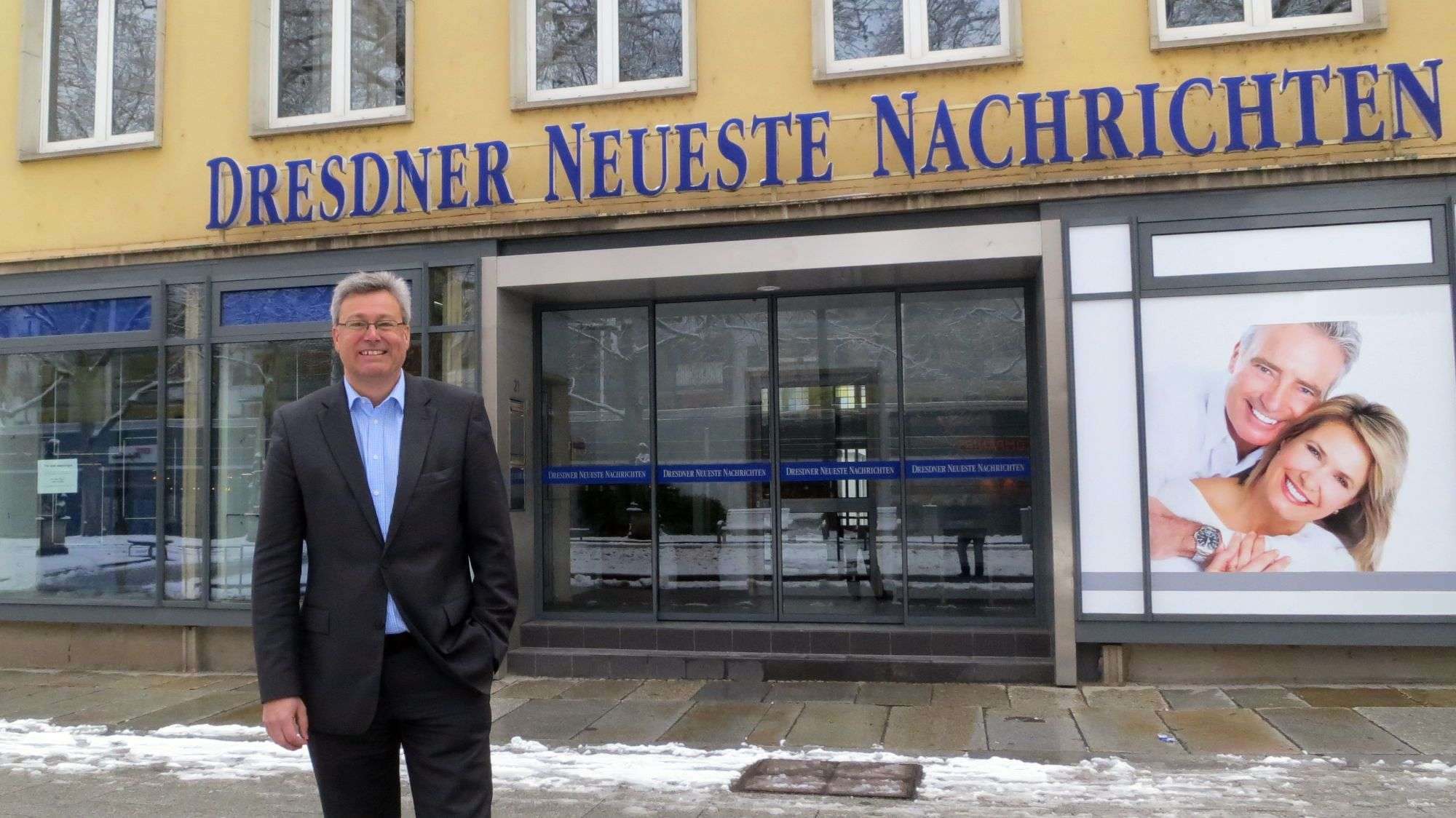 Abschied ohne Wehmut – Dirk Birgel vor dem alten Sitz der DNN.Ein Dinosaurier hat sich davon gemacht. Seit Anfang der Woche ist die Redaktion der Dresdner Neuesten Nachrichten (DNN) von der Hauptstraße auf den Dr.-Külz-Ring umgezogen. Chefredakteur Dirk Birgel gab gestern noch einen kleinen Einblick in das nun leer stehende Gebäude und zeigt voller Stolz seine neuen Redaktionsräume auf der anderen Elbseite. „Wehmut kann ich nicht empfinden“, sagt Birgel.