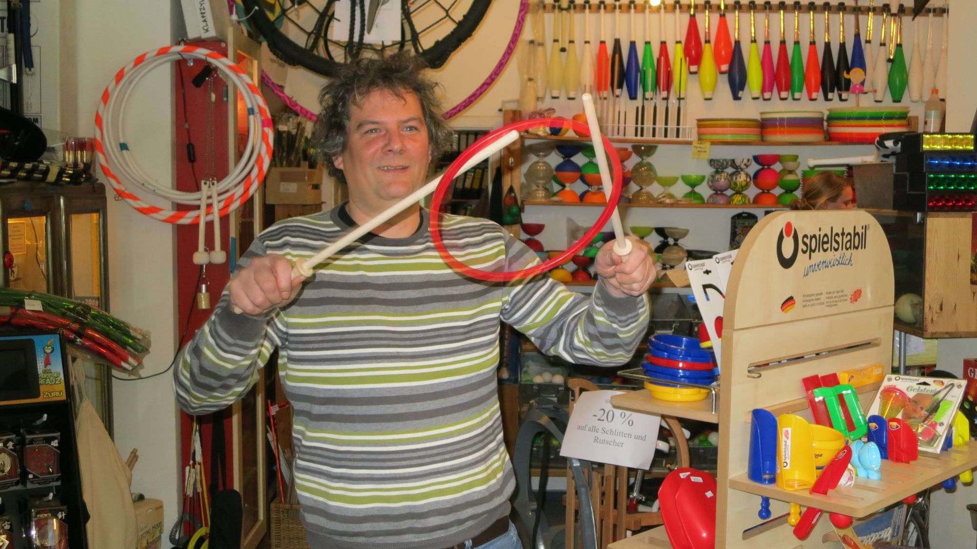 Diabolos in allen Farben und Größen.Dort auf der Alaunstraße war anfangs nicht so viel los. „Wir haben öfter mal vor dem Laden in der Hängematte zwischen den Fahrradständern gelegen“, erzählt er und grinst von einem Ohr zum anderen. Das war aber auch nicht so schlimm, da sie nur wenig Miete zahlen mussten. „Der Laden war unsaniert, wir haben mit Kohle geheizt und bei Regen hatten wir fließend Wasser an der Außenwand.“ Anfang des Jahrtausends zog der Laden dann um auf die „Rothenburger“. Hier in der Nummer 11 ist nun mehr Platz, das Sortiment wurde breiter. Es reicht von Tüchern und Holzspielzeug für die Allerkleinsten bis hin zu Spielen für Erwachsene. Wenn man im Laden steht, ist eigentlich immer was los. Jongleure probieren mal fix die neuen Bälle oder ein elektrisches Spielzeug wird vorgeführt. „Das und kompetente Beratung gibt es eben nur im Laden“, sagt Tim, dem diverse Billig-Anbieter im Internet das Leben schwer machen. Die Pläne für einen eigenen Online-Shop stecken aber noch in der Schublade.
