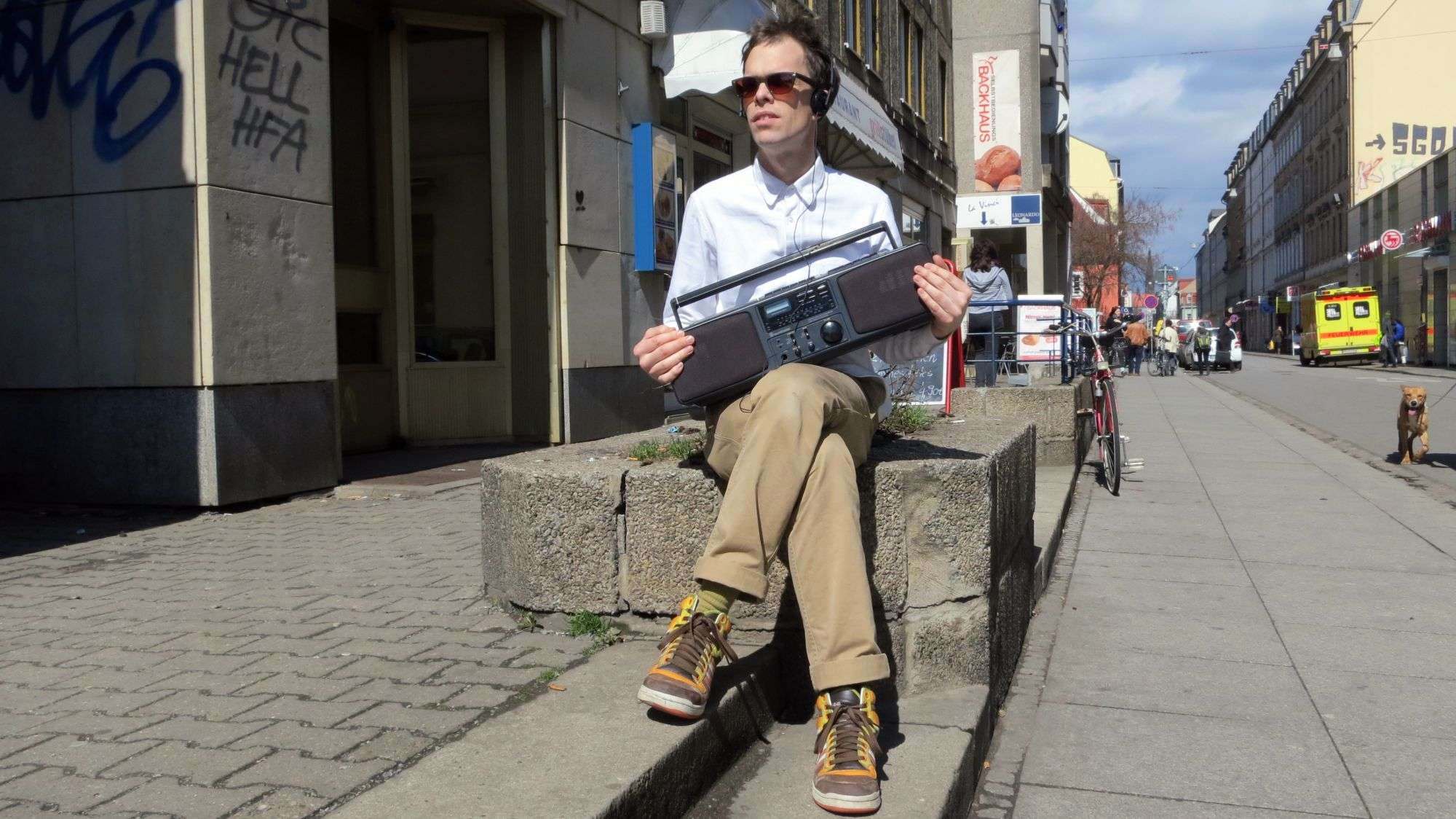 „Es handelt sich um einen 40-minütigen Audio-Walk“, erklärt mir Ant. Während man hier drin sitzt, kann man ungestört auf die Straße schauen, Vergangenheit und Gegenwart vergleichen, dazu den Texten aus den Kopfhöhrern lauschen. „Wir haben die Alaunstraße ausgewählt, weil es hier wenige Autos, dafür viele Fußgänger gibt“, Ant ist ganz fasziniert von dem Ort. Wenn man sich umschaut, versteht man, was ihn antreibt. Menschen strömen vorbei, die Straße lebt. Plötzlich steht die junge Frau im Café auf, nimmt das Radio unter den Arm und geht nach draußen. Der zweite Teil der Performance findet im Freien statt.