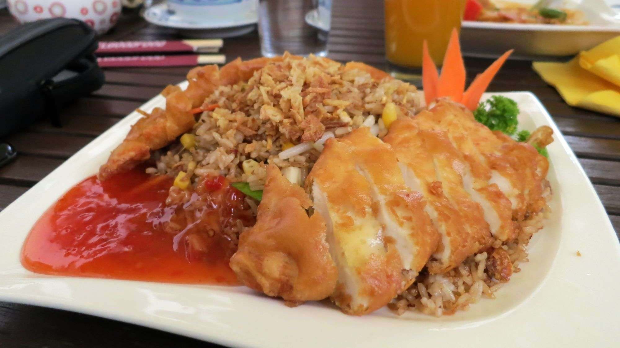 Hühnerbrust an gebratenem ReisAn der unteren Alaunstraße versteckt sich dieses kleine Lädchen mit typisch asiatischer Küche. Zur Mittagszeit ist es gut gefüllt, als ich mit ein paar Kollegen mit ordentlich Appetit den Laden entere.