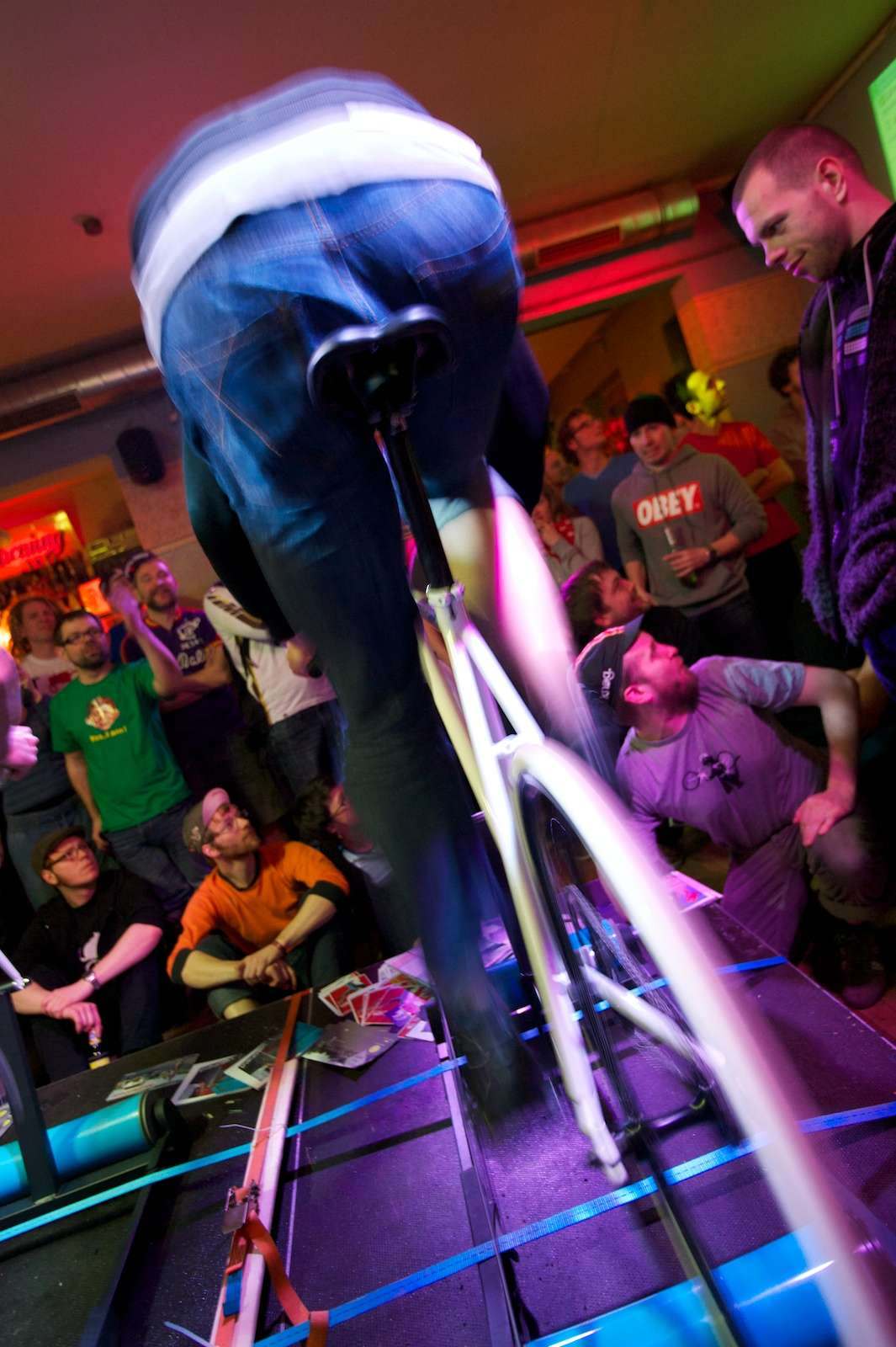 Rollensprint – Foto: PR/Robert GeblerAm Sonnabend steigt in der Schauburg, das „Bicycle Film Festival“. Neben vielen Kurzfilmen, die in zwei Programmblöcken ab 20 Uhr zu sehen sein werden, gibt es auch ein Programm für die Waden. Um 11 Uhr startet an der Schauburg ein sogenanntes „Alleycat“. Bei dieser etwa zweistündigen Ralley quer durch die Stadt bekommen die Teilnehmer am Start Aufgaben, um verschiedene Checkpoints in Dresden anzufahren. An einigen Punkten gibt es dann Stempel, die im Ziel vorzeigt werden müssen. Gewinner ist der oder die, welcher oder welche am schnellsten alle Stempel erhalten hat und diese im Ziel am Ost-Pol vorzeigen kann. Von 15 bis 19:30 Uhr findet im Ost-Pol ein Rollensprint-Wettbewerb statt. Dabei werden Fahrräder wie bei einem Spinnigkurs auf Rollen geschnallt und man kann auf der Stelle treten. Dort steigt dann auch die After-Show-Party.