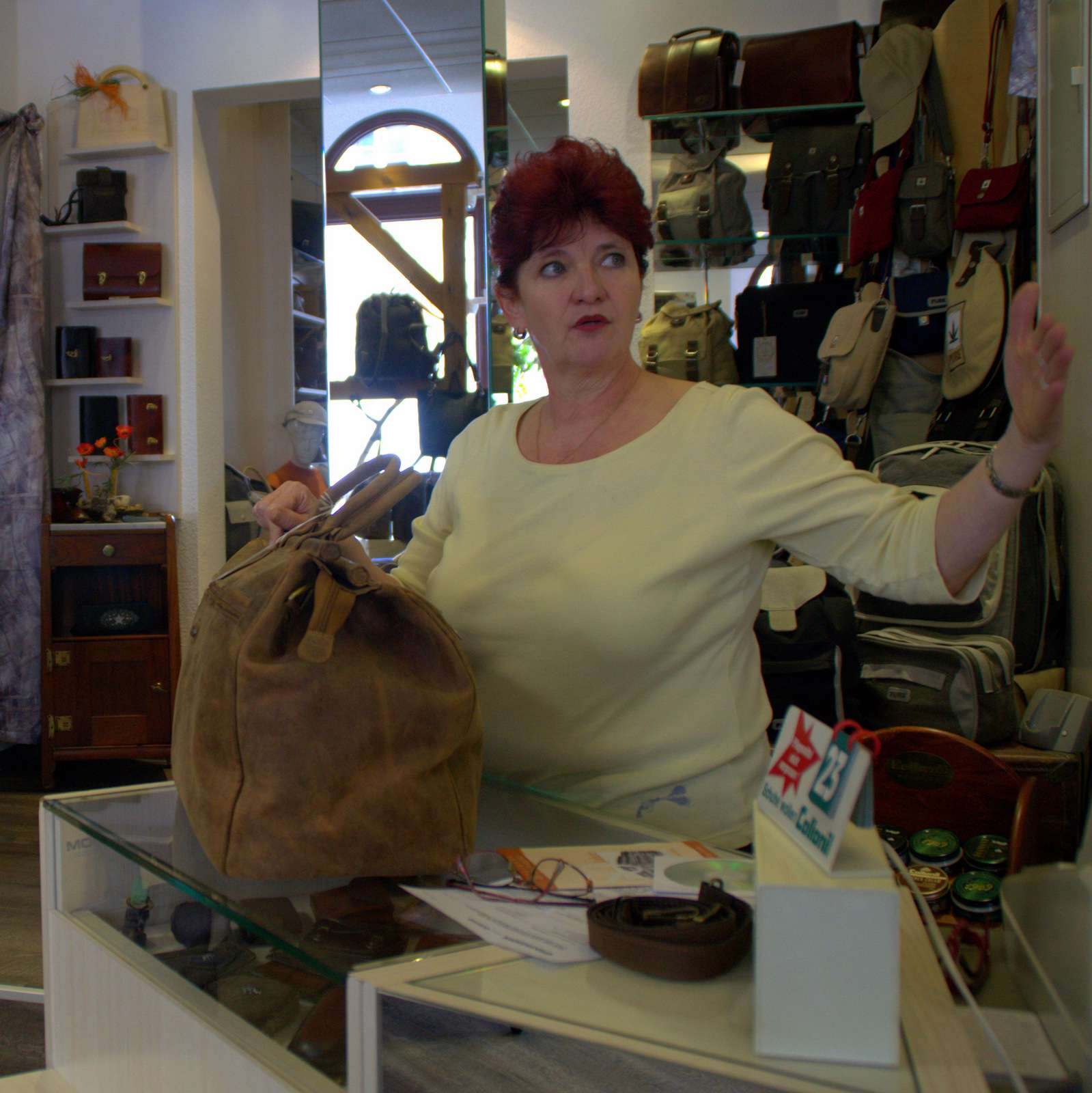 Ihr Laden macht seinem Namen alle Ehre. Uta-Maria Radke verkauft nur Schätze unter den Tragehüllen. Und, stellt sie klar, nicht an jeden. Der Käufer muss sich der Tasche erst würdig erweisen, da gibt’s kein „Nehm ich eben die“. Qualität hat ihren Preis und verdient ihren Respekt, so ist das nun mal. Und so gewinnt man das Gefühl, man adoptiere eine Tasche, anstatt sie nur zu kaufen. Fast schon hatten wir uns zum Abschied die Hand geschüttelt, da fällt der kennende Blick von Frau Radke auf meine Umhängetasche. Mit Leichtigkeit überführt sie mein vermeintliches Flohmarkt-Kunstleder anhand des Innenfutters der Herkunft aus hohem Designerhause, attestiert zwar etwas blasse Haut, aber mit dem richtigen Lederfett … Dann widmet sich ihre ganze Aufmerksamtkeit einem hilflos umher blickenden Kunden. Ach, eine Tasche für die Frau? Kunststoff, Leinen, Leder? Groß, klein, zum Wandern, Tragen, Flanieren? Na, wir finden schon was. Eifrig flattert sie davon, so schnell, dass sie auf einem Foto kaum einzufangen ist.