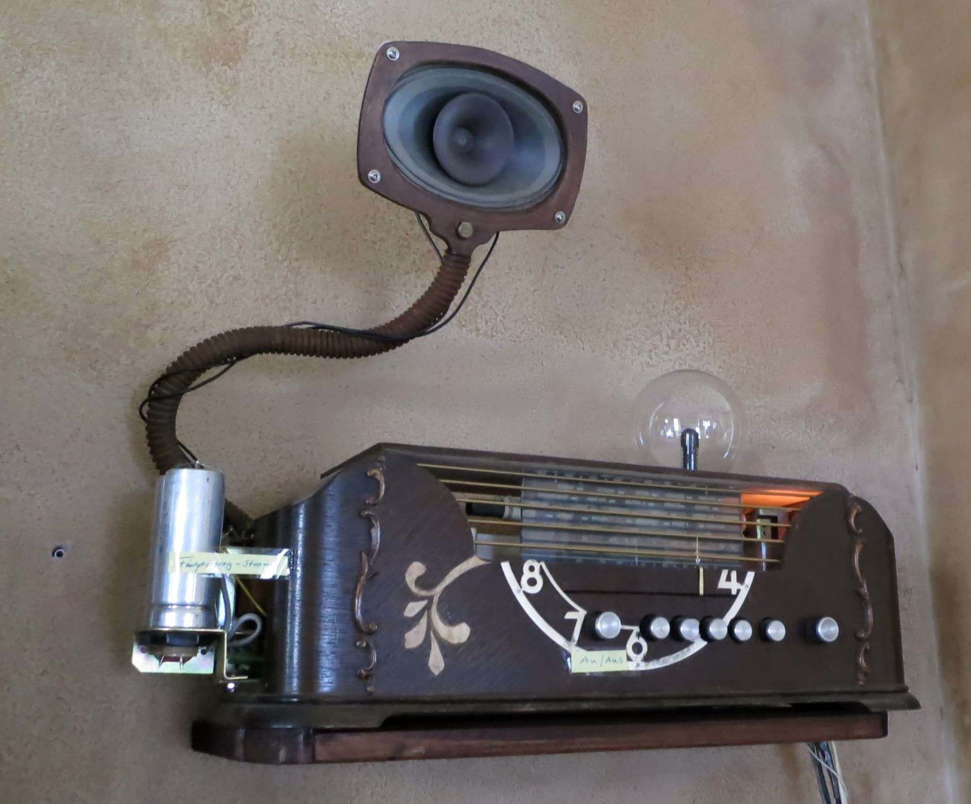 Neben mir steht ein großes altes Buffet in dem selbstgebaute Tastaturen aus Holz liegen – gegenüber ein umgebautes, altes Radio welches aussieht als wäre es einem postapokalyptischen Film entsprungen. Er „schimpft“ sich selbst nicht als Künstler. Aber ich denke, er hat sich die Bezeichnung redlich verdient.