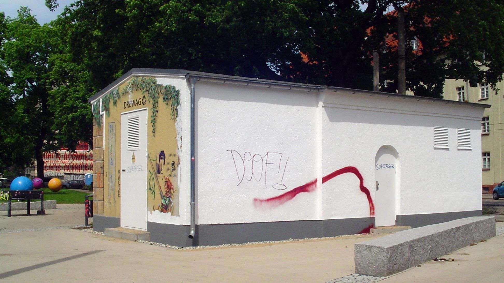 Am Bischofsplatz hat jemand das Drewag-Häuschen weiß gestrichen. Irgendwie erinnert mich das an eine Szene aus dem Film „Beat Street“ – einer der Graffiti-Künstler hatte eine weiße U-Bahn entdeckt und war begeistert.