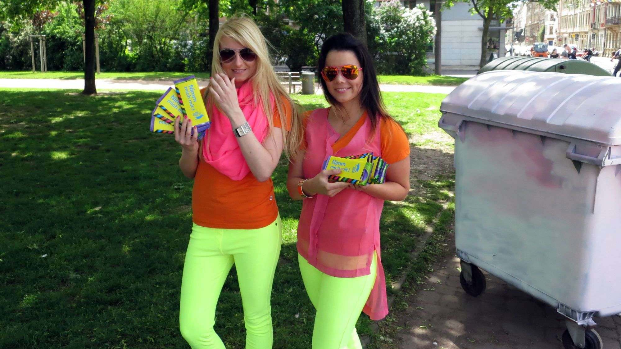 An den nächsten Wochenenden werden zwei Schokoladenmädchen Tafeln auf dem Platz verteilen. Die Schokolade ist in eine „Nimm mich mit!“-Banderole eingewickelt. Die zeigt im Inneren eine Übersichtkarte des Alaunplatzes mit den Standorten der insgesamt 33 dauerhaften Papierkörbe und Mülltonnen.
