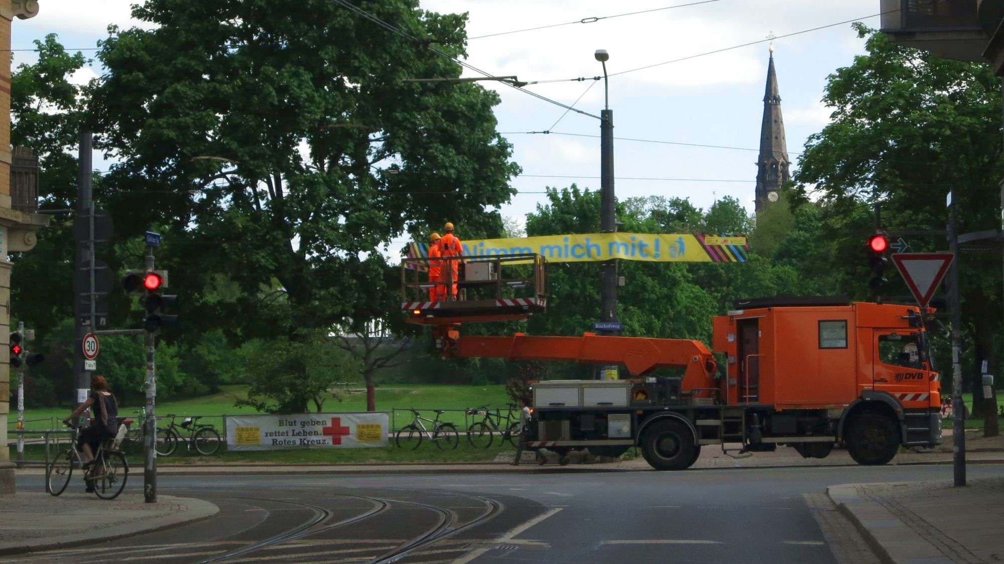 Heute Morgen haben Mitarbeiter der Dresdner Verkehrsbetriebe ein acht Meter breites Banner mit der Botschaft „Nimm mich mit!“ aufgehängt. Gemeint ist der Müll.