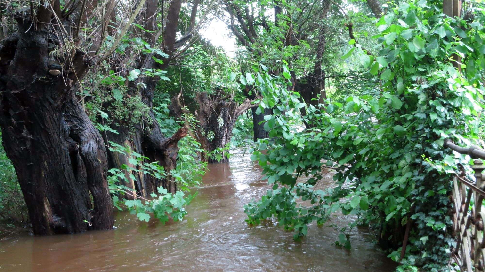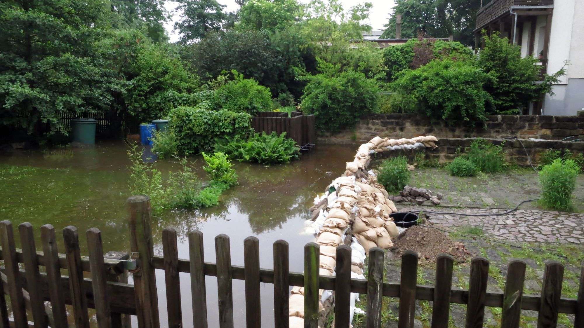 Haus unter Wasser, das Hinterhaus der Genossenschaft ist überflutet.Wer an der Nordstraße unseren geliebten Bach überquert, könnte annehmen, dass sich die Lage entspannt hat. Unter der Brücke ist viel mehr Luft als noch gestern. Die Erklärung ist einfach: Der Regen hat aufgehört, es kommt nicht mehr so viel Wasser aus der Heide nach. Aber das Problem kommt nun von vorn, von der Elbe. Die hat in den letzten Stunden nochmal einen ordentlichen Pegel-Sprung gemacht: 13.45 Uhr wurden 7,61 Meter gemessen. Die amtliche Prognose liegt zwar immer noch bei „nur“ 8,85 Metern, aber das ist nur der Ausblick bis Donnerstag.