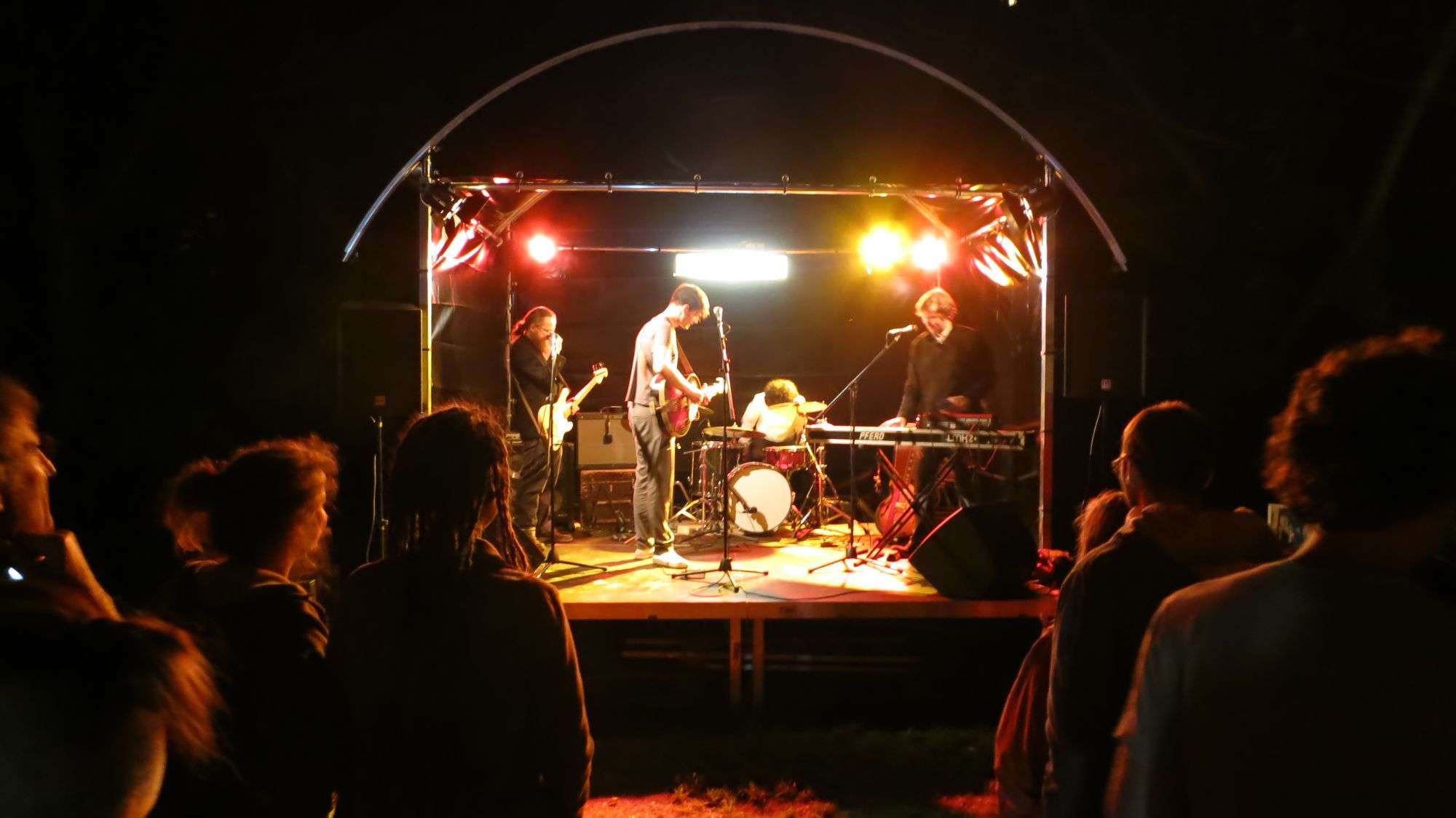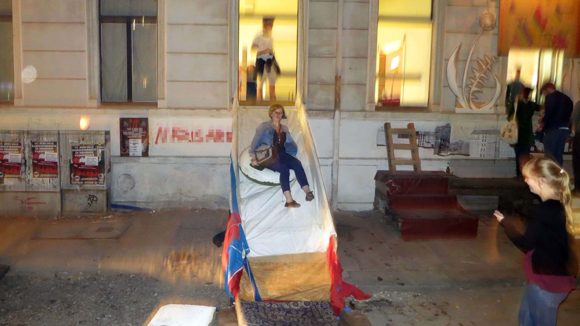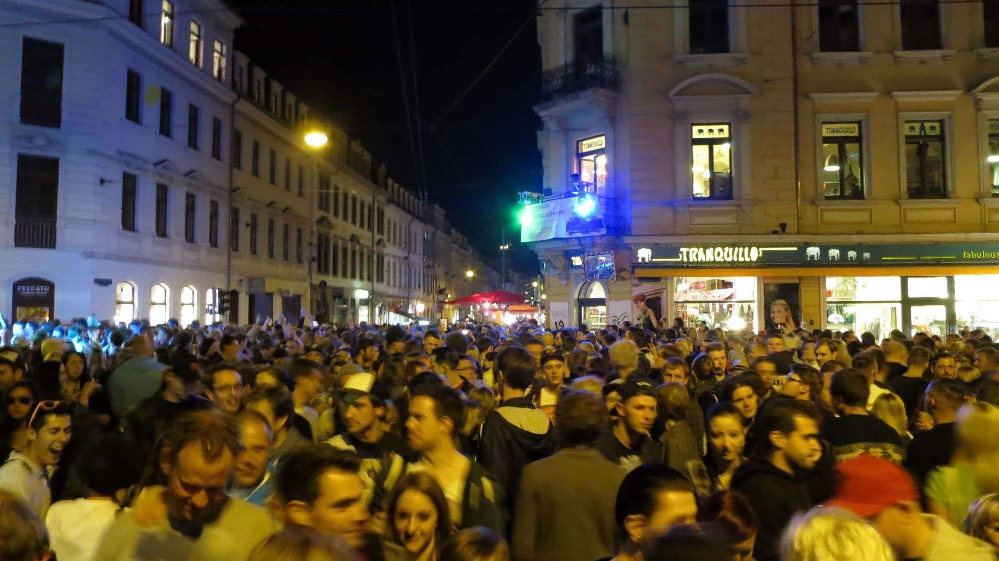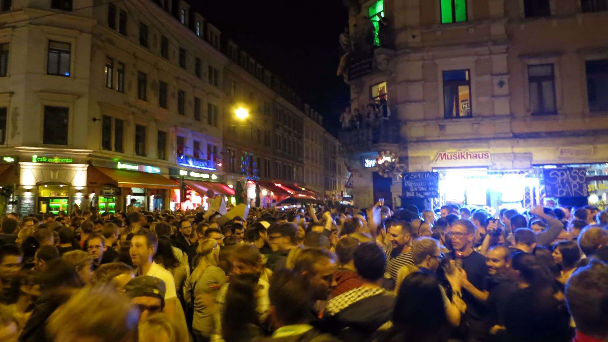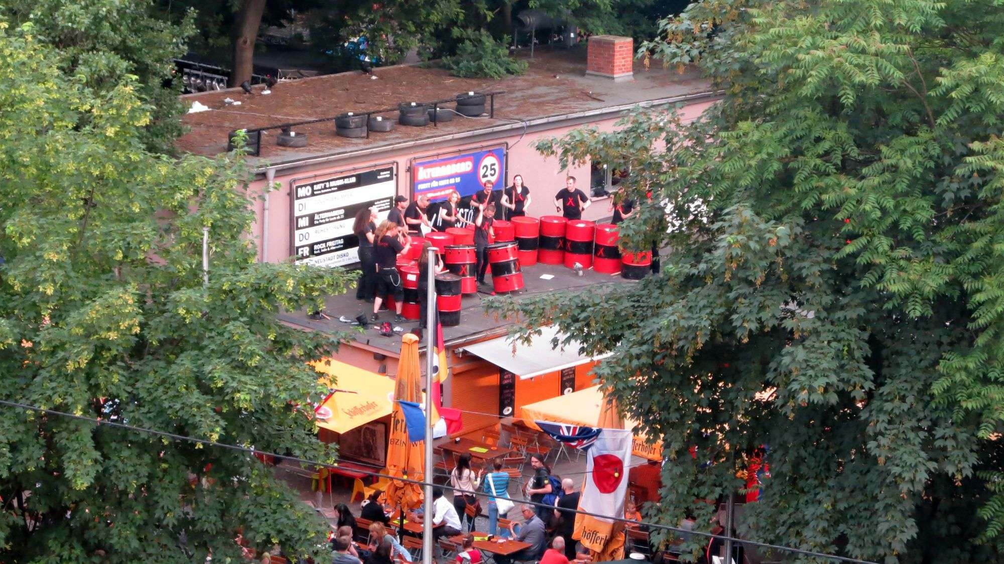 Blechlawine auf dem Dach von Katys GarageVorm Eckstein darf ich Bier aus dem Glas trinken, wenn ich verspreche mich nicht zu entfernen. Hab ich auch nicht vor, kann ich doch hier der Blechlawine lauschen. Wilde Trommler und ihre Ölfässer, sehr imposant. Gentrifizierungsopfer hängen über der LouisenstraßeAls das Bier ausgetrunken ist, beginne ich mit der obligatorischen Runde. Das Schwarze Schaf beeindruckt mit einer Gold-Fassade, gegenüber hängen die Gentrifizierungsopfer am seidenen Faden. Eines von vielen Hinterhofkonzerten: die cosmic comboGegenüber falle ich auch in den ersten Hinterhof mit Konzert. Die cosmic combo sind junge Burschen, die die elektronisch verstärkte Gitarren-Musik ihrer Großväter wieder aufleben lassen. BRN-Flagge unter der DiskokugelAuf der anderen Straßenseite locken eine Discokugel und hämmernder Beat in den Hof. Streng dreinblickende Security steht am Eingang, solche werden mir im Laufe des Abends öfter auffallen als Polizei oder Polizeibehörde.Mickey als Freibeuter … sehr maritimes Thema an der Louisen-Ecke Martin-Luther-StraßeAuf der Kamenzer sollen die Piraten eine „Insel“ angemeldet haben, davon war nicht viel zu sehen, aber schön, wenn es mal luftiger ist und man mal frei treten kann.Geschicklichkeitsspiel auf der KamenzerDanach folgte der etwas längere Zwischenstopp auf der Talstraße, um die eingangs beschriebene Feuershow zu begutachten. Auf der Pulsnitzer wurde ich dann fast in ein merkwürdiges Dosenspiel verwickelt.Bierdosen-Kubb oder so ähnlich auf der Pulsnitzer StraßeNächste Etappe: Kukulida am unteren Ende der Martin-Luther-Straße. Handgemachte Musik verzaubert das Publikum, dass hier gern barfuß tanzt und Shirts und Hosen flattern lässt. Daneben ein hübscher Wurfstand. Mit jedem Treffer kann man die Neustadt weiter gentrifizieren. Vorm Kukulida sorgte ein Gentrifizierungswurfspiel und lustig Musik für Aufmerksamkeit. Rutschen ins Glück