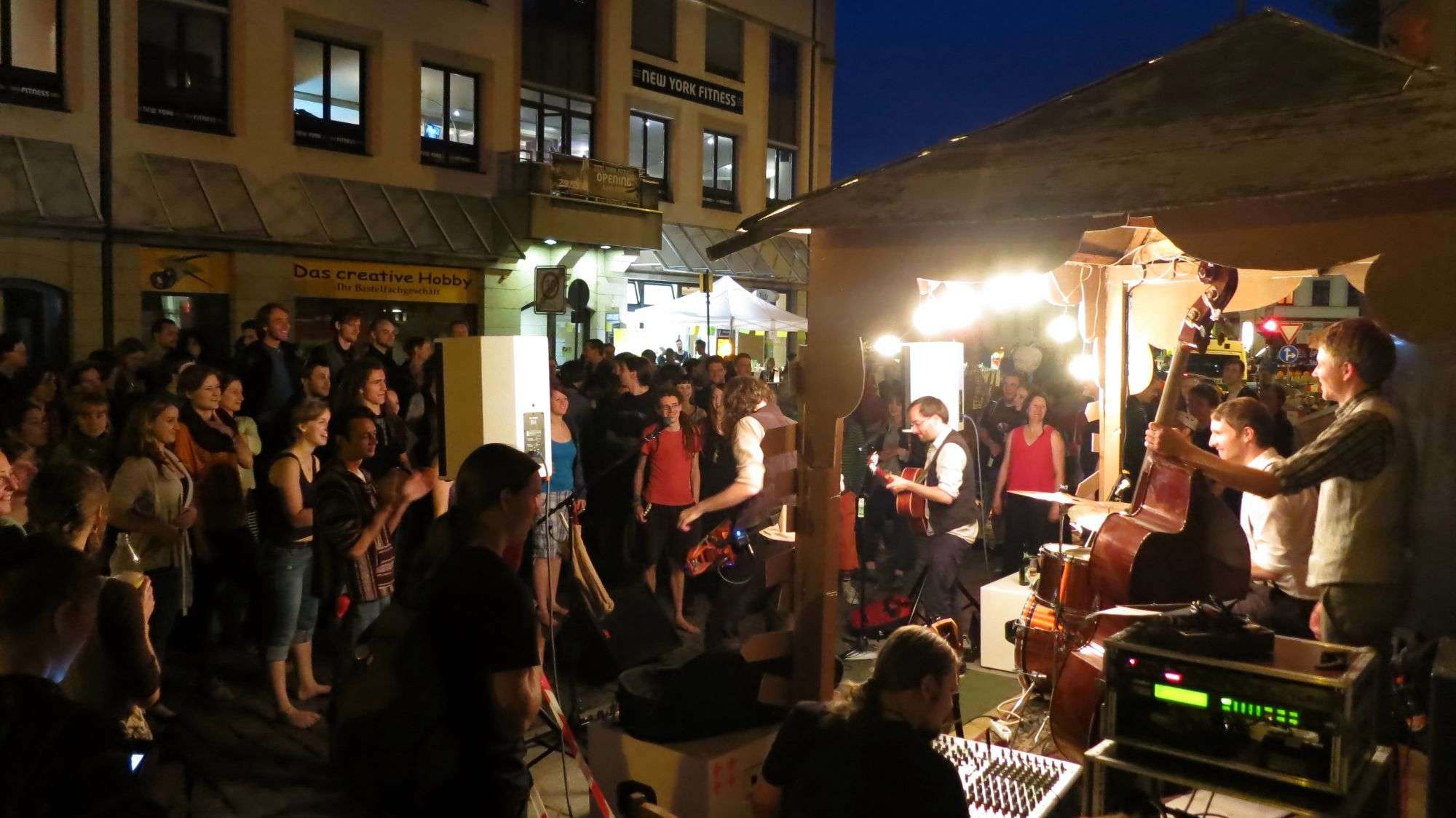 Über den Hintehof geht es durch eine Lücke im Zaun zum Lustgarten-Gelände. Hier rocken die Herren von Dré Imbicz, ich schaue in die Runde, wieviele stehen hier: 1000, 2000 – das ist wie ein Open-Air-Festival, die Stimmung steigt als ein Bandmitglied von der Bühne springt und sich über die Hände tragen lässt. Die deutsch-amerikanisch-ungarische Polka-Punk-Band Dré Imbicz rockte den Lustgarten. Die Lichtinstallation von Claudia Reh tauchte das Parkhaus in bislang ungeahnte Farbigkeit.Durch das winzige Nadelöhr des „Stilbruch“ geht es wieder mitten rein ins BRN-Treiben. Auf der Rothenburger Straße scheint das Publikum komplett ausgetauscht. Die Burschen sind muskulöser und bei den Klamotten der Mädels flattert nichts mehr. Trichter-Saufen ist der große Knüller. Und dennoch: Die bedrohliche Stimmung vergangener Jahre, die ich hier oft gespürt habe, ist weg. Selbst knallharte Hooligans grinsen mich fröhlich an. Musikhaus-Neustadt-Chef Peter Pfundt nutzte den Balkon vom Tranquillo um die Massen hüpfen zu lassen.Höhepunkt dieser Szenerie ist die Ecke zur Louisenstraße. Vorm Musikhaus tanzen die Massen, soweit es im Gedränge eben geht. Mit unglaublicher Eleganz schlängelt sich, den Cocktail-Becher balanzierend, eine ganze Truppe junger Mädels an mir vorbei. Musikhaus-Neustadt-Chef Peter Pfundt nutzte den Balkon vom Tranquillo um die Massen hüpfen zu lassen.Danach Luft holen im Thalia – mit einem Bierchen und Barhocker ausgestattet, beobachte ich das Treiben. Fühle mich ein bisschen wie die ZK-Oberen auf der Ehrentribüne zur 1.-Mai-Demonstration, Honecker-Masken wären jetzt nicht schlecht. Im Hinterhof ist es plötzlich wieder ganz anders. Eine Band, deren Mitglieder wie eine Mischung aus Frank Zappa und ZZ-Top aussehen, spielt besinnliche Musik. Das Publikum ist teils auch schon etwas in die Jahre gekommen. Gespräche werden geführt, der Blue-Note-Chef grinst und schenkt Alkoholika aus. Entspannung pur. Bedächtige Klänge hinterm Thalia: BrokofNoch schnell zum Alaunplatz, Merkwürden hat schon Schluss gemacht, die Besucher strömen wieder ins Viertel. Entsprechender Stau ist auf der Alaunstraße. Enttäuschung: Der Zirkus an der Sebnitzer ist gar keiner, sondern nur eine weiteres DJ-Pult mit Boxen. Vorm Boys klingt mein musikalischer Abend mit einem aktuellen Top-Ten-Hit aus. Kurz nach 1 Uhr ist Ruhe. Wie übrigens bei allen größeren Ständen. Verlängerten Krach machen offenbar nur diejenigen, die noch nicht in den Genuß saftiger Bußgelder gekommen sind.