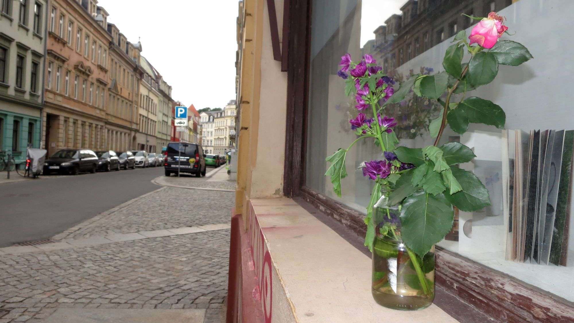 ich kombiniere mal so, die Blumen sind vielleicht für den verstorbenen Keramiker Heiner Bauer, dessen Bild im Schaufenster steht ..in memoriam sozusagen.