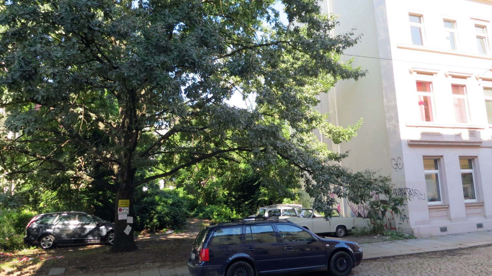 Das Stückchen wilde Szene mit wildem Parkplatz unter der Eiche wird ab Montag dann aber auf jeden Fall fehlen. Eine Anwohnerin hatte extra das Umweltamt eingeschaltet, das in der Vergangenheit den Fällantrag mehrfach abgelehnt hatte, aber nun wohl stattgeben musste. Sie schreibt, dass die Anwohner wütend und traurig sind, da die riesige Eiche das Straßenbild präge und den Eingang der Frühlingstraße über so viele Jahre beschützt habe.