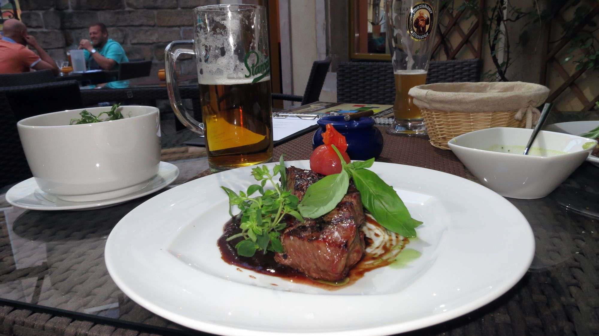 In Windeseile ist der freundliche Kellner bei uns. Die erste Freude: Es gib tschechisches Bier. Ansonsten beherbergt die Karte die für solche Etablissements üblichen Verdächtigen. Es gibt Rib-Eye-, Rump-, Hüft- und noch ein paar andere Steaks. Da werden unsere Erwartungen erfüllt. Darüber hinaus gibt es Salate, verschiedene Kartoffel-Spezialitäten, Burger und auch Fisch. Die Preise sind ein wenig günstiger als in vergleichbaren Einrichtungen auf der anderen Elbseite. Ich entscheide mich für ein Rumpsteak, dazu wünsche ich mir Bratkartoffeln ohne Kümmel und einen Tomatensalat. Der Kellner wirbelt. Wir schwätzen und freuen uns über das schöne Wetter und den Ausblick auf die Sebnitzer Straße.