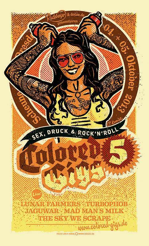 Vor ein paar Jahren besuchte er die Hamburger Ausstellung Flatstock und dachte sich, so etwas müsste man für Dresden auch haben und die Idee der „Colored Gigs“ war geboren. In diesem Jahr sind wieder mehr als ein Dutzend Künstler dabei, die alle auch vor Ort sind und für hartnäckige Fanfragen zur Verfügung stehen. „Die kommen überwiegend aus Amerika, aber in diesem Jahr haben wir auch viele Holländer dabei“, umreißt Krause die Internationalität der Ausstellung. Im vergangenen Jahr war die Veranstaltung gut besucht, statt Sex waren aber vor allem Bärte zu sehen.