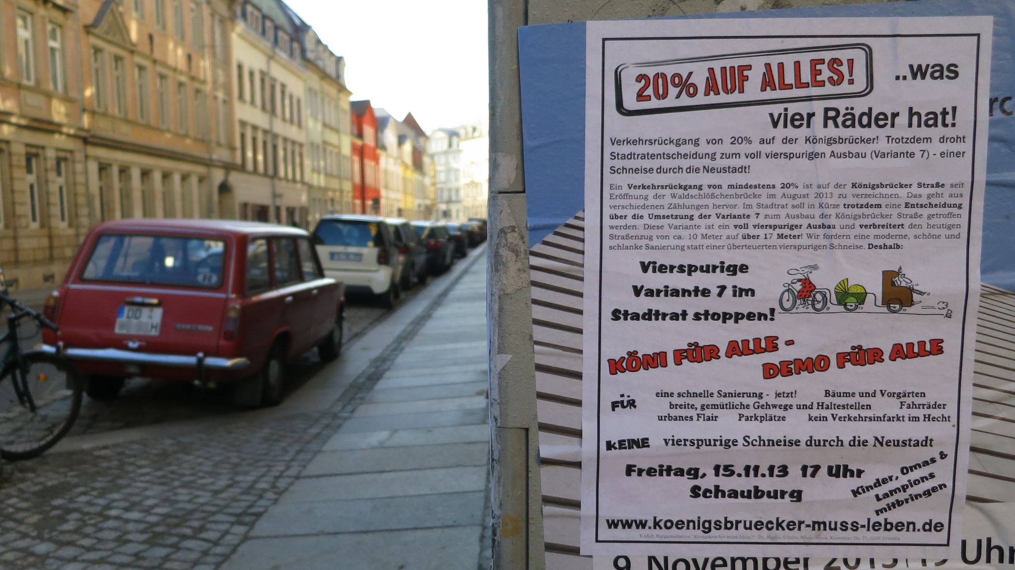 Auch wenn es denen nicht passt, die von ihrem hübschen Vorstadt-Reihenhäuschen zur Arbeit in die Stadt düsen: Auch in der Neustadt wohnen Menschen und auch die wollen keine Autobahn vor der Tür. Die Königsbrücker ist eine lebendige Straße und soll das auch bleiben!