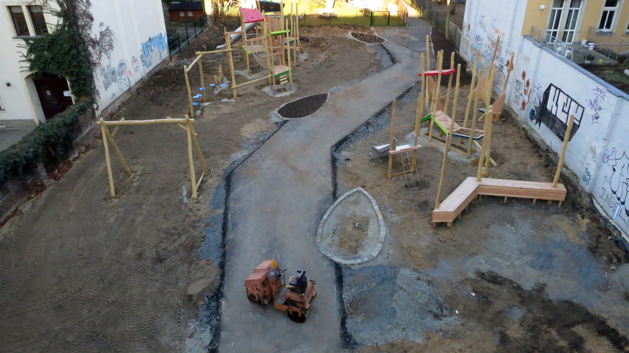 Zwischen Hort und Straße entsteht derzeit der Spielplatz. Der Durchgang zum Panama oder zur Seifhennersdorfer Straße soll mit Abschluss der Arbeiten wieder möglich sein. Zwischen Spielplatz und Louisenstraße entsteht ein kleiner Stadtplatz. Hier befinden sich künftig zwei Stellplätze für Car-Sharing, Fahrradständer, außerdem bekommt das benachbarte „Max“ hier noch ein paar Außensitze und auch die „Fotokiste“ kommt wieder zurück.