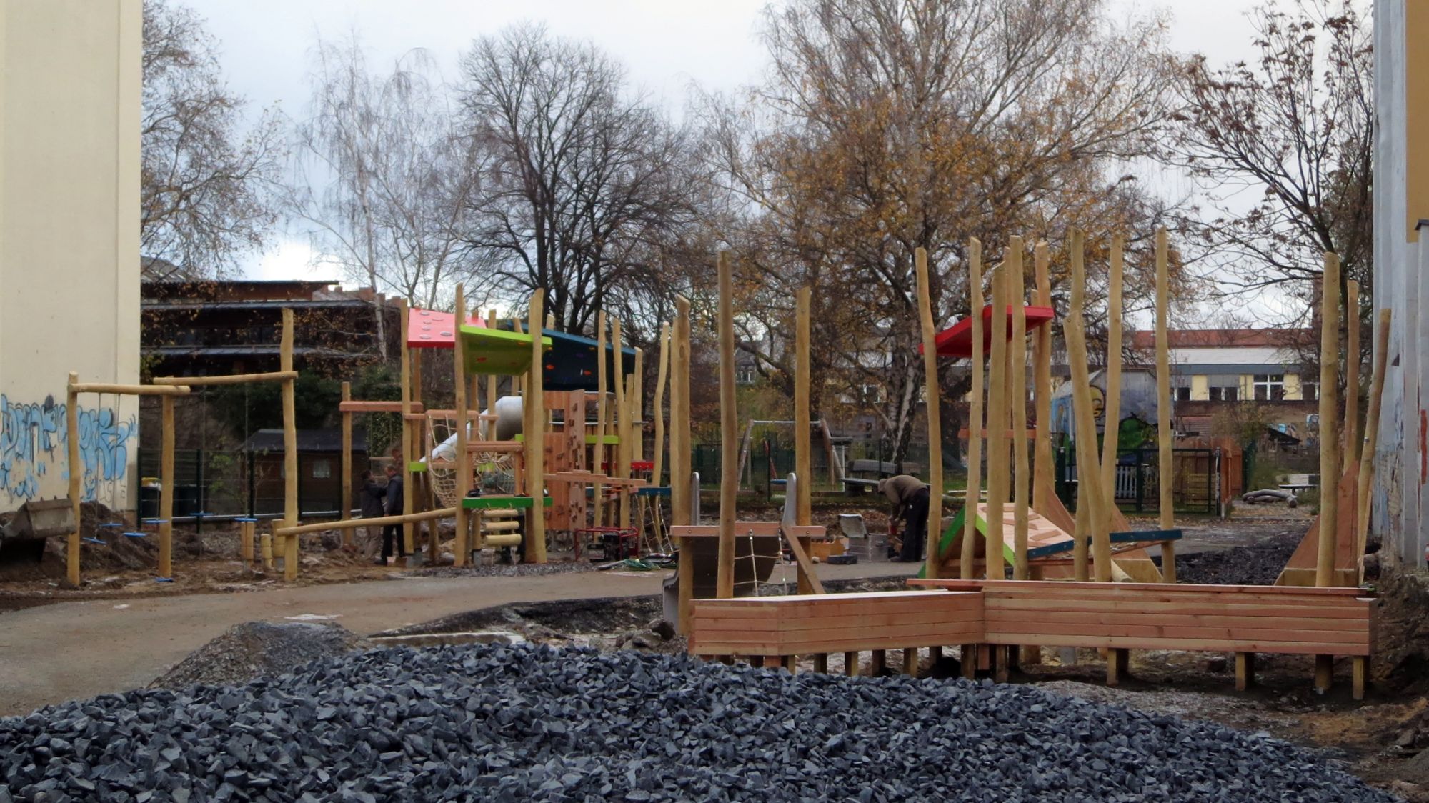 Auf dem ehemaligen Parkplatz und dem Hintereingang zum Panama tut sich was. Seit dem Sommer wird der Platz umgestaltet. In den vergangenen Wochen sind die ersten Klettergerüste eingezogen und mit schwerem Gerät wurde planiert und gebaggert.
