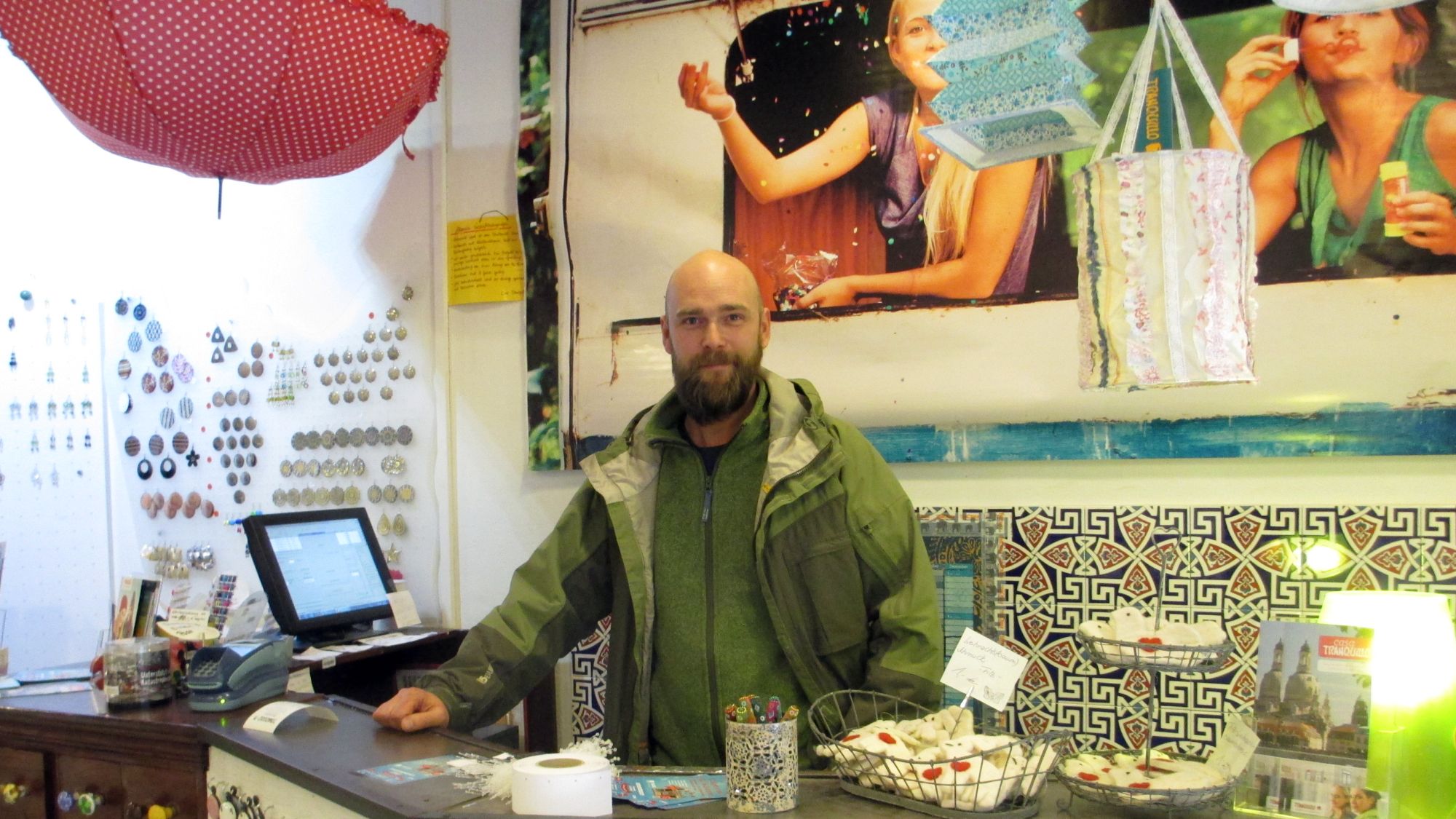 Michael Kremer hinter dem Tresen des „Ur-Ladens“. Die Jacke verrät, dass er sich als zweiter Geschäftsführer nur noch selten dort aufhält.Das Tranquillo gehört neben dem Mrs. Hippie zu den typischen Aushängeschildern der Neustadt: buntgeflickte und gemusterte Klamotten im folkloristischen Stil. Erste Assoziationen: Pumphosen und Flatterhemdchen, Spiegelpailetten und Patchouli-Rücherstäbchen. Von diesem Klischee des „Hippie-Chic“ wollen sich die Besitzer Christian Amthor und Michael Kremer langsam emanzipieren, ohne ihre Wurzeln zu verleugnen. Die Erfolgsgeschichte eines Geschäfts, das mittlerweile fünf Filialen und einen Onlineshop betreibt – und weiter hinaus will.