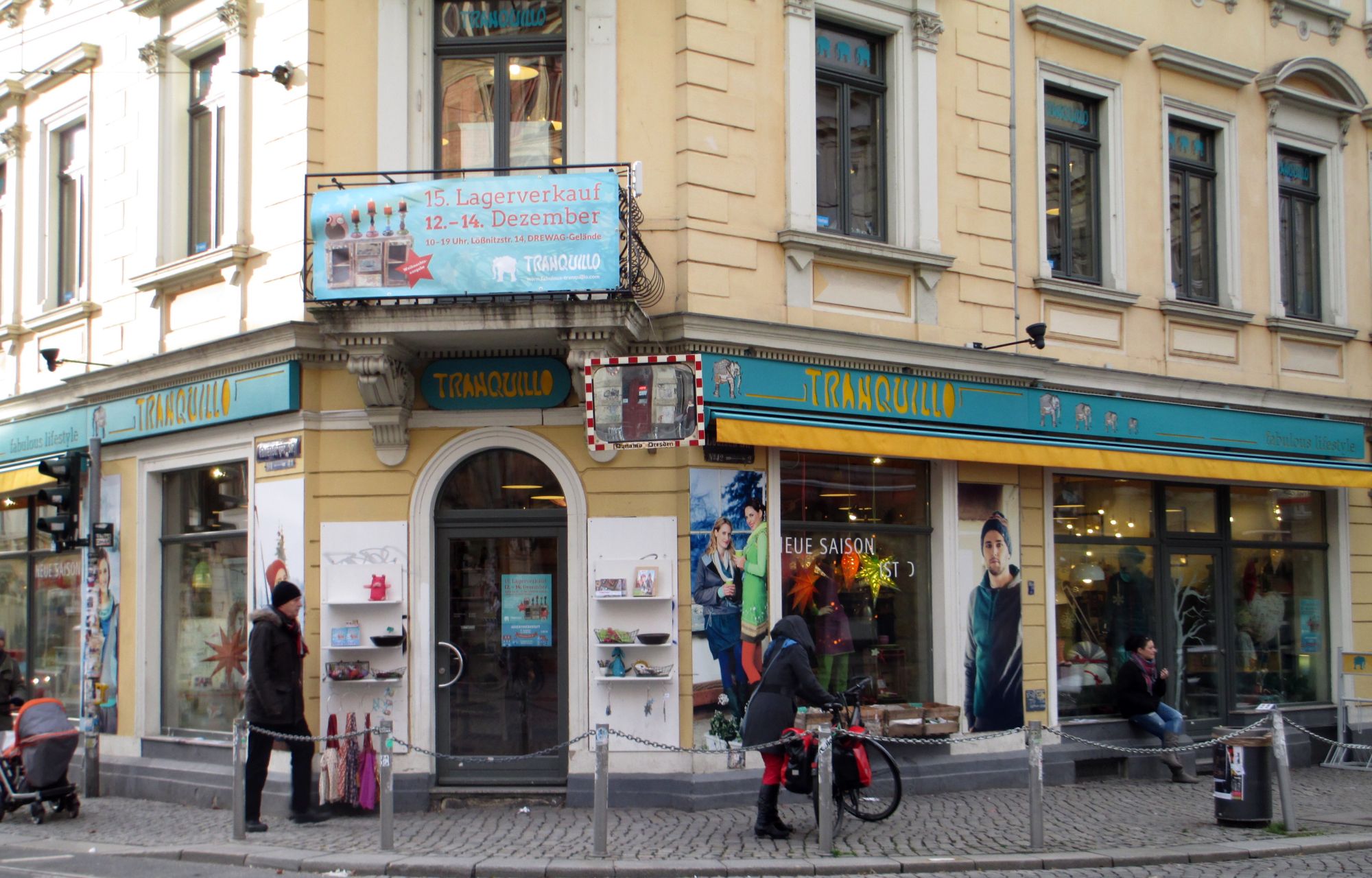 Der „Ur-Laden“ Tranquillo liegt eingezwängt zwischen Little Creatures und Projekttheater auf der Louisenstraße 45. Ein schmales Schaufenster, ein schlauchförmiger Verkaufsraum, der den Besucher wie einen Maulwurf in die hinteren Gefilde lotst. Der Boden uneben, die Luft zugig. Im Hinterraum bollerte winters ein Standofen. Christian Amthor gründete das Tranquillo 2000 als Second Hand-Laden unter bescheidenen Voraussetzungen. Eine einjährige Asienreise inspirierte ihn, Produkte aus Indien und Nepal in sein Sortiment aufzunehmen. Er stöberte auf Basaren Kleidung, Schmuck, Lämpchen und Taschen auf, die während der Re-Hippie-Welle in Dresden großen Anklang fanden. Nach und nach verlagerte sich Amthor ausschließlich auf die Geschäftsverbindungen nach Asien. Heute entwerfen drei Designer Kleidungsstücke, die in dort ansässigen Fabriken hergestellt und dann versendet werden. Auch die drei weiteren Filialen in Leipzig, Berlin und München werden von so versorgt. Produkte aus Deutschland ergänzen das Angebot, sonst käme man wohl mit dem Auffüllen der Regale nicht hinterher.