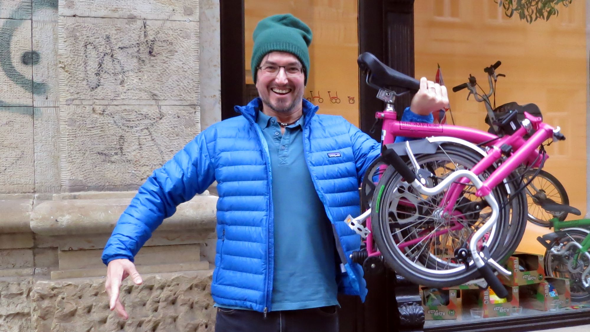 Wenn man es klappt, klappt es zusammen.Die „Brompton“-Räder sind nicht billig. Einen Tausender sollte man schon einplanen, dafür hat man dann ein handgemachtes Radl, dass man zusammenklappen und mit in die Kneipe nehmen kann. Ich werde zu einer Proberunde genötigt und sitze wenig später auf dem Teil mit der langen Sattelstange und den winzigen Rädern. Naja, wer es mag …