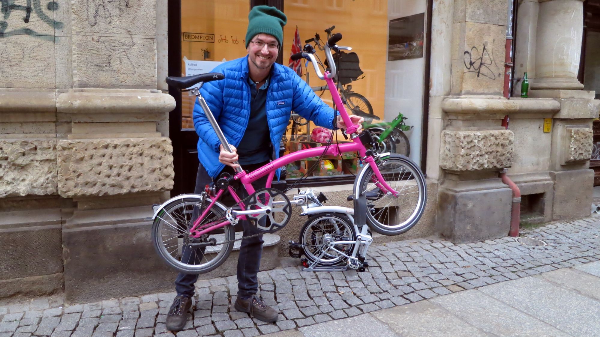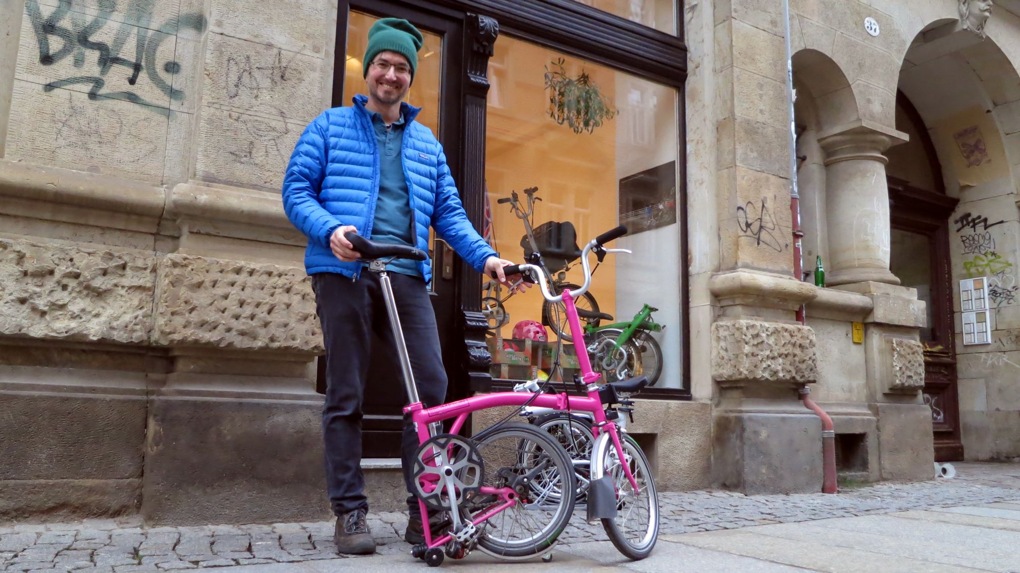 ein ganzes Rad – 10 Kilo leichtAuf der Görlitzer Straße hat in der vergangenen Woche Dresdens erster Faltradladen eröffnet. Winnie Heun will hier, wo einst Nägel gefeilt und poliert wurden, die englischen Kulträder der Marke „Brompton“ an den Mann oder die Frau bringen. Als ich ihn vor Ort besuche, erzählt er mir gut gelaunt von seiner Leidenschaft für die Klappräder. Ich muss beim Thema Faltrad ja immer an Mifa denken und meine ersten Fahrversuche irgendwo im Wald zwischen Guben und Eisenhüttenstadt, aber ich schweife ab. Während Winnie noch strahlt und erklärt und zeigt, platzen schon die ersten Kunden in den Laden. Eine forsche Seniorin und ihr abwartender Mann lassen sich das Rad erklären. Hm, ob Winnie an eine solche Zielgruppe gedacht hat, als er das Lädchen in der Neustadt angemietet hat? Eigentlich ist er Kameramann und eigentlich kommt er aus Berlin, Prenzlauer Berg. Aber der Familie wegen ist er nun hier und nun will er sein Hobby den Dresdnern nahebringen.