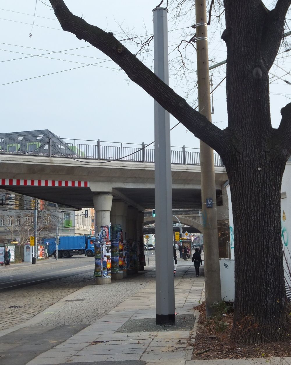 Herumstehende Masten gibts ja nicht nur von der DVB. Auch stehen meist die ordinären Straßenschilder mitten auf dem Fußweg und das gleich noch im Rudel. Ein Beispiel gibts neben dem Continental (heißt das noch so?) auf der Louisenstraße, wo man zwischen den Schildern und dem Bargestühl grad mir Kinderwagen kaum durchkommt. Warum stehen die eigentlich nicht auf der Straße, betrifft ja schließlich die Fahrzeuge und nicht die Fußgänger. Eleganter wäre sicher eine Befestigung am Gebäude – vermutlich darf man das aber nicht (mehr)?