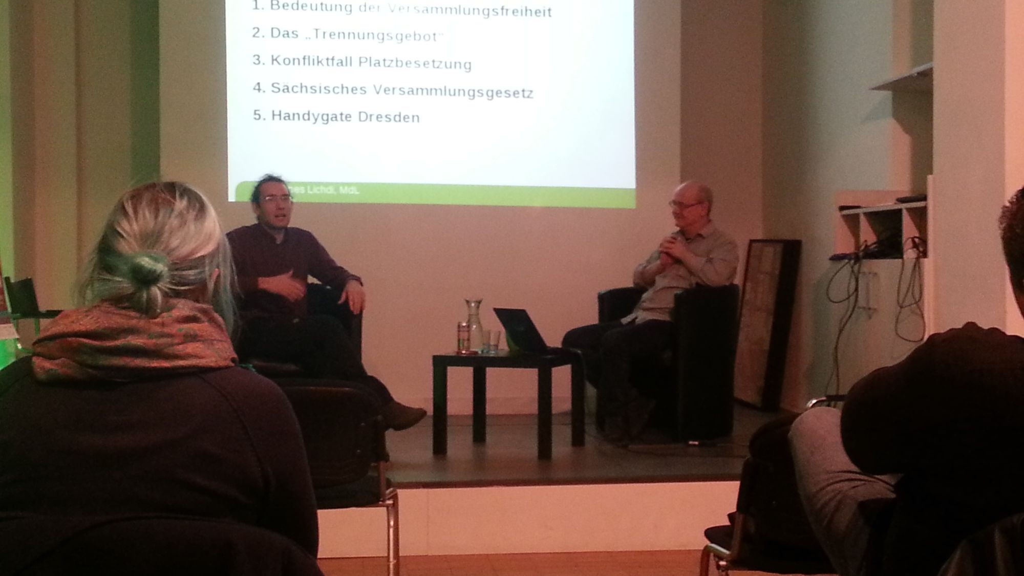 Zur thematischen Einstimmung zeigt Hans, Organisator bei Dresden Nazifrei und Moderator des Abends, einen musikalisch-untermalten Videoclip aus dem Jahr 2011. Und dann geht aus auch schon los: „Wenn es keine Versammlung gibt, gibt es auch keine Demokratie“, beginnt Lichdi sein Referat über Versammlungsfreiheit und Platzbesetzungen. Prinzipiell sei der Begriff „Versammlung“ als eine gemeinsame Kundgabe von Meinungen aufzufassen, wobei Thema, Mittel, Ort und Zeit des Geschehens von den Akteuren selbst bestimmt werden können. Um dem Grundrecht laut Art. 8 Grundgesetz (GG) gerecht zu werden, sei es wichtig, so Lichdi, dass der Einsatz von Gewalt prinzipiell außer Frage stünde. Gleichzeitig betont er, dass eine Sitzblockade eine friedliche Protestform darstelle und einzelne Gewalttäter einer Versammlung ihr diesen Charakter nicht absprechen würden.