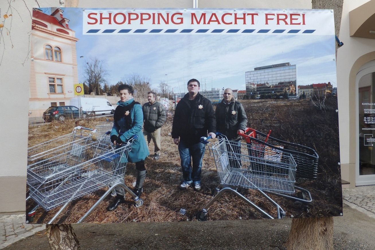 Performance: Shopping macht freiVor dem Hintereingang des Kunsthaus Dresden, der städtischen Galerie für Gegenwartskunst in der Rähnitzgasse, hängt derzeit dieses Plakat. Dabei handelt es sich um ein Kunstwerk von Tamara Moyzes, die eine Performance in Prag abbildet. Es geht um den unscheinbaren Platz Holešovice in Prag. Von hier aus wurden zwischen 1941 und 1945 44.688 Menschen in Konzentrationslager deportiert. 2002 wurde der Plan gefasst, auf dem Gebiet ein Einkaufszentrum sowie ein Rathaus zu errichten. Teil des Bauvorhabens war auch die Einrichtung eines öffentlich zugänglichen Gedenkraumes für die Opfer des Holocaust. 2006 wurde die in der Slowakei geborene Künstlerin Tamara Moyzes aufgefordert, den Entwurf für dieses Denkmal zu gestalten.