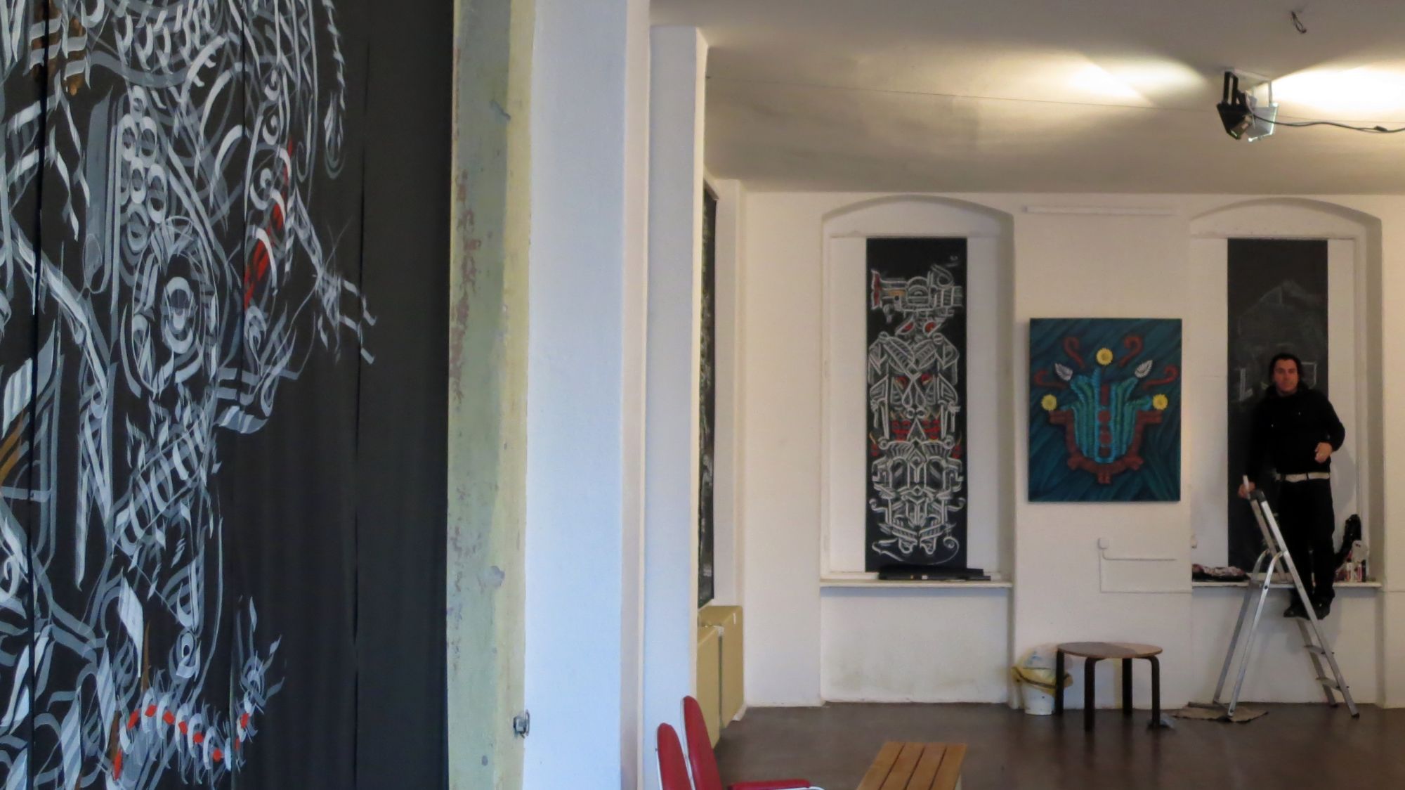 Das Projektteam vom „Hole of Fame“ hat ihm für zwei Wochen den Raum zur Verfügung gestellt. Seit dem 21. Januar hat Victor die Kunstwerke entworfen. Dabei hält er sich mit Farben deutlich zurück. Der wichtigste Marker ist weiß: „Mit verschiedenem Druck erreiche ich verschiedene Schattierungen“, erklärt der 36-Jährige, der aus Mexico-City stammt und der Liebe wegen nach Deutschland gekommen ist. Seit fünf Jahren nimmt er regelmäßig an Festivals und Ausstellungen in Italien, der Schweiz, den Niederlanden, Tschechien oder Deutschland teil. Seine Kunst ist beeinflusst von der präkolumbianischen Anahuak-Kultur. Während der Ausstellungseröffnung kann man dem Künstler bei der Arbeit über die Schulter schauen.