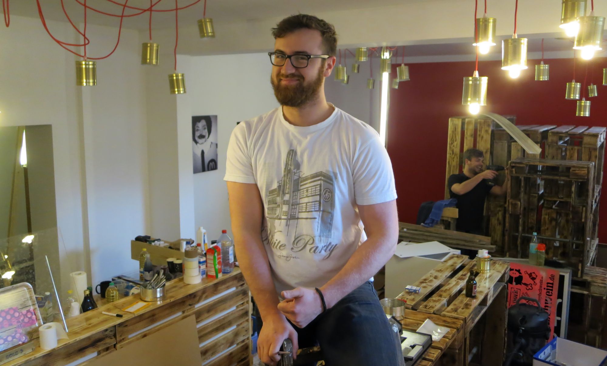 Bis zur Eröffnung ist noch jede Menge zu tun. Die Jungs wollen die Nacht durchschuften und bitten eventuelle Augenringe morgen Abend zur Eröffnung zu Verzeihen. Bei der Einrichtung habe sie sich auch einiges einfallen lassen. Das Stichwort lautet: „Upcycling“ – fast alles im Imbiss war schon mal im Gebrauch, von den Euro-Palletten, die jetzt Tisch und Bänke sind, über die Blechdosen-Beleuchtung an der Decke bis hin zum „Gemälde“ aus alten Brettern.