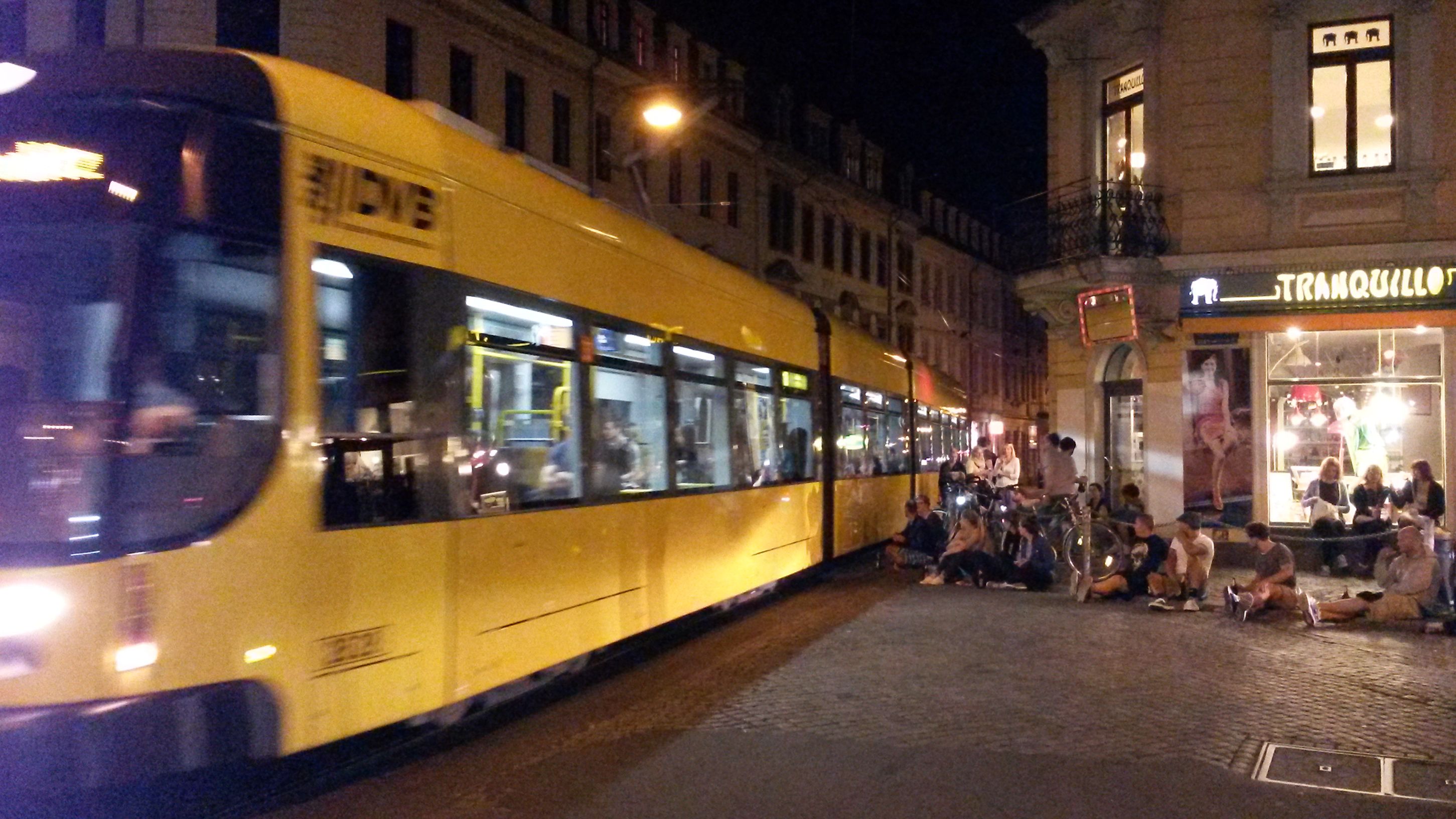 Heute ist man offenbar extrem uncool, wenn man seinen Hintern auf dem Fußweg platziert. Harte Kerle und taffe Mädels strecken ihre Beinchen munter auf der Straße. Bleibt ihnen zu wünschen, dass die anderen extrem coolen Buben in ihren tiefergelegten PS-Schleudern immer schön in der Mitte der Fahrbahn ihre Reifen versengen. Die „Görlitzer“ gen Alaunplatz lädt doch zum Beschleunigungsrennen förmlich ein.